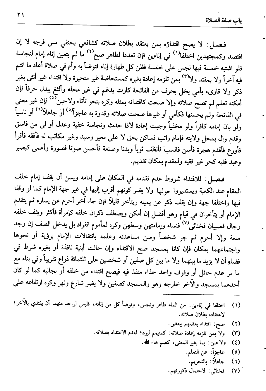 فصل: لا يصح اقتداؤه بمن يعتقد بطلان صلاته كشافعي بحنفي مس فرجه لا أن افتصد وكمجتهدين اختلفا1 في إناءين فإن تعدد الطاهر صح2 ما لم يتعين إناء إمام لنجاسة فلو اشتبه خمسة فيها نجس على خمسة فظن كل طهارة إناء فتوضأ به وأم في صلاة أعاد ما ائتم فيه آخرا ولا بمقتد ولا3 بمن تلزمه إعادة وصح بغيره كمستحاضة غير متحيرة ولا اقتداء غير أنثى بغير ذكر ولا قارئ بأمي يخل بحرف من الفاتحة كأرت يدغم في غير محله وألثغ يبدل حرفا فإن أمكنه تعلم لم تصح صلاته وإلا صحت كاقتدائه بمثله وكره بنحو تأتاء ولاحن4 فإن غير معنى في الفاتحة ولم يحسنها فكأمي أو غيرها صحت صلاته وقدوة به عاجزا5 أو جاهلا6 أو ناسيا ولو بان إمامه كافرا ولو مخفيا وجبت الإعادة لاذا حدث ونجاسة خفية وعدل أولى من فاسق وقدم وال بمحل ولايته فإمام راتب فساكن بحق لا على معير وسيد غير مكاتب له فأفقه فأقرأ فأورع فأقدم هجرة فأسن فأنسب فأنظف ثوبا وبدنا وصنعة فأحسن صوتا فصورة وأعمى كبصير وعبد فقيه كحر غير فقيه ولمقدم بمكان تقديم.