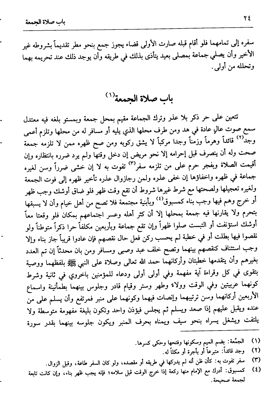 تتعين على حر ذكر بلا عذر ترك الجماعة مقيم بمحل جمعة أو بمستو بلغه فيه معتدل سمع صوت عال عادة في هدو من طرف محلها الذي يليه أو مسافر له من محلها وتلزم أعمى وجد2 قائدا وهما وزمنا وجد مركبا لا يشق ركوبه ومن صح ظهره ممن لا تلزمه جمعة صحت وله أن ينصرف قبل إحرامه لا نحو مريض إن دخل وقتها ولم يزد ضرره بانتظاره أو أقيمت الصلاة وبفجر حرم على من لزمته سفر3 تفوت به لا إن خشي ضررا وسن لغيره جماعة في ظهره وإخفاؤها إن خفي عذره لمن رجا زوال عذره وتأخير ظهره إلى فوت الجمعة ولغيره تعجيلها ولصحتها مع شرط غيرها شروط أن تقع وقت ظهر فلو ضاق أو شك وجب ظهر أو خرج وهم فيها وجب بناء كمسبوق4 وبأبنية مجتمعة فلا تصح من أهل خيام وأن لا يسبقها بتحرم ولا يقارنها فيه جمعة بمحلها إلا إن كثر أهله وعسر اجتماعهم بمكان فلو وقعتا معا أوشك استؤنفت أو التبست صلوا ظهرا وأن تقع جماعة وبأربعين مكلفا حرا ذكرا متوطنا ولو نقصوا فيها بطلت أو في خطبة لم يحسب ركن فعل حال نقصهم فإن عادوا قريبا جاز بناء وإلا وجب استئناف كنقصهم بينهما وتصح خلف عبد وصبي ومسافر ومن بان محدثا إن تم العدد بغيرهم وأن يتقدمها خطبتان وأركانهما حمد الله تعالى وصلاة على النبي صلى الله عليه وسلم بلفظهما ووصية بتقوى في كل وقراءة آية مفهمة وفي أولى أولى ودعاء للمؤمنين بأخروي في ثانية وشرط كونهما عربيتين وفي الوقت وولاء وطهر وستر وقيام قادر وجلوس بينهما بطمأنينة وإسماع الأربعين أركانهما وسن ترتيبهما وإنصاف فيهما وكونهما على منبر فمرتفع وأن يسلم على من عنده ويقبل عليهم إذا صعد ويسلم ثم يجلس فيؤذن واحد وتكون بليغة مفهومة متوسطة ولا يلتفت ويشغل يسراه بنحو سيف ويمناه بحرف المنبر ويكون جلوسه بينهما بقدر سورة