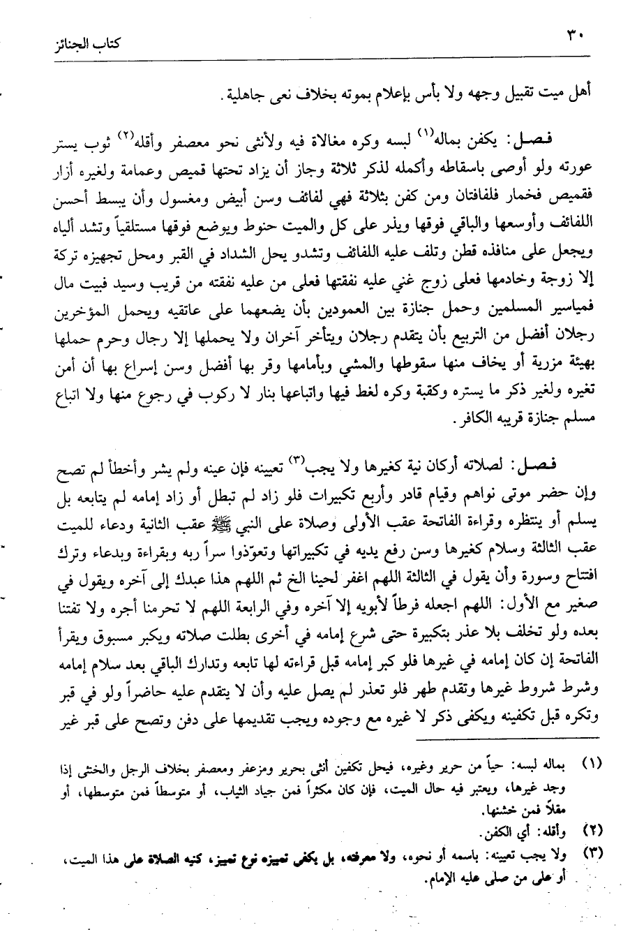 فصل: يكفن بماله1 لبسه وكره مغالاة فيه ولأنثى نحو معصفر وأقله2 ثوب يستر عورته ولو أوصى بإسقاطه وأكمله لذكر ثلاثة وجاز أن يزاد تحتها قميص وعمامة ولغيره إزار فقميص فخمار فلفافتان ومن كفن بثلاثة فهي لفائف وسن أبيض ومغسول وأن يبسط أحسن اللفائف وأوسعها والباقي فوقها ويذر على كل والميت حنوط ويوضع فوقها مستلقيا وتشد ألياه ويجعل على منافذه قطن وتلف عليه اللفائف وتشد ويحل الشداد في القبر ومحل تجهيزه تركة إلا زوجة وخادمها فعلى زوج غني عليه نفقتها فعلى من عليها نفقته من قريب وسيد فبيت مال فمياسير المسلمين وحمل جنازة بين العمودين بأن يضعهما على عاتقيه ويحمل المؤخرين رجلان أفضل من التربيع بأن يتقدم رجلان ويتأخر آخران ولا يحملها إلا رجال وحرم حملها بهيئة مزرية أو يخاف منها سقوطها والمشي وبأمامها وقربها أفضل وسن إسراع بها إن أمن تغيره ولغير ذكر ما يستره كقبة وكره لغط فيها واتباعها بنار لا ركوب في رجوع منها ولا إتباع مسلم جنازة قريبه الكافر.
