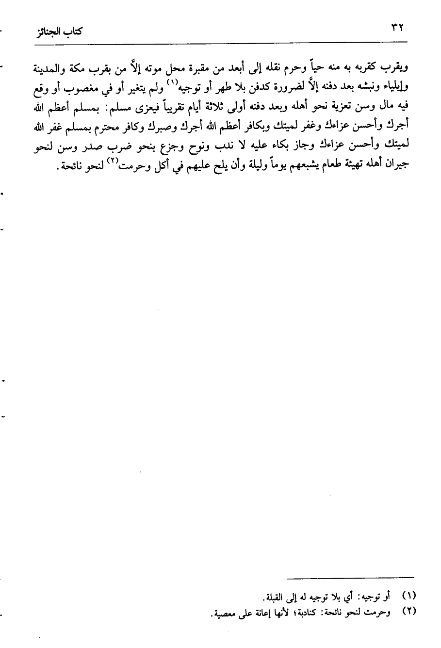 ويقرب كقربه منه حيا وحرم نقله إلى أبعد من مقبرة محل موته إلا من بقرب مكة والمدينة وإيليا ونبشه بعد دفنه إلا لضرورة كدفن بلا طهر أو توجيه1 ولم يتغير أو في مغصوب أو وقع فيه مال وسن تعزية نحو أهله وبعد دفنه أولى ثلاثة أيام تقريبا فيعزى مسلم بمسلم أعظم الله أجرك وأحسن عزاءك وغفر لميتك وبكافر أعظم الله أجرك وصبرك وكافر محترم بمسلم غفر الله لميتك وأحسن عزاءك وجاز بكاء عليه لا ندب ونوح وجزع بنحو ضرب صدر وسن لنحو جيران أهله تهيئة طعام يشبعهم يوما وليلة وأن يلح عليهم في أكل وحرمت2 لنحو نائحة.