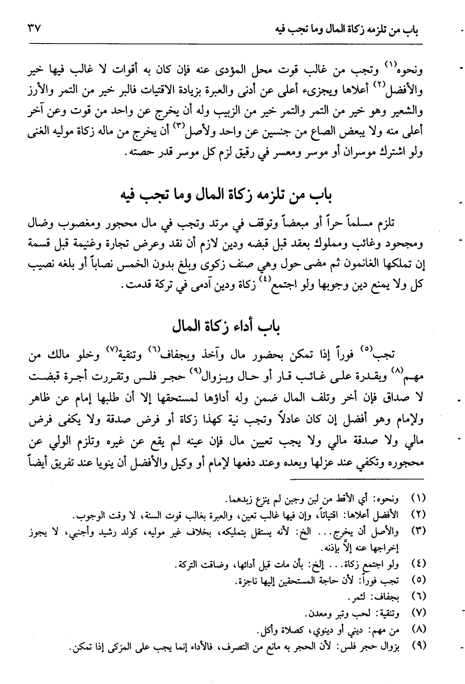 تجب1فورا إذا تمكن بحضور مال وآخذ وبجفاف2 وتنقية3 وخلو مالك من مهم4 وبقدرة على غائب قار أو حال وبزوال5 حجر فلس وتقررت أجرة قبضت لا صداق فإن أخر وتلف المال ضمن وله أداؤها لمستحقها إلا إن طلبها إمام عن ظاهر ولإمام وهو أفضل إن كان عادلا وتجب نية كهذا زكاة أو فرض صدقة ولا يكفي فرض مالي ولا صدقة مالي ولا يجب تعيين مال فإن عينه لم يقع عن غيره وتلزم الولي عن محجوره وتكفي عند عزلها وبعده وعند دفعها لإمام أو وكيل والأفضل أن ينويا عند تفريق أيضا وله أن يوكل فيها ولا تكفي نية إمام بلا إذن إلا عن ممتنع وتلزمه.