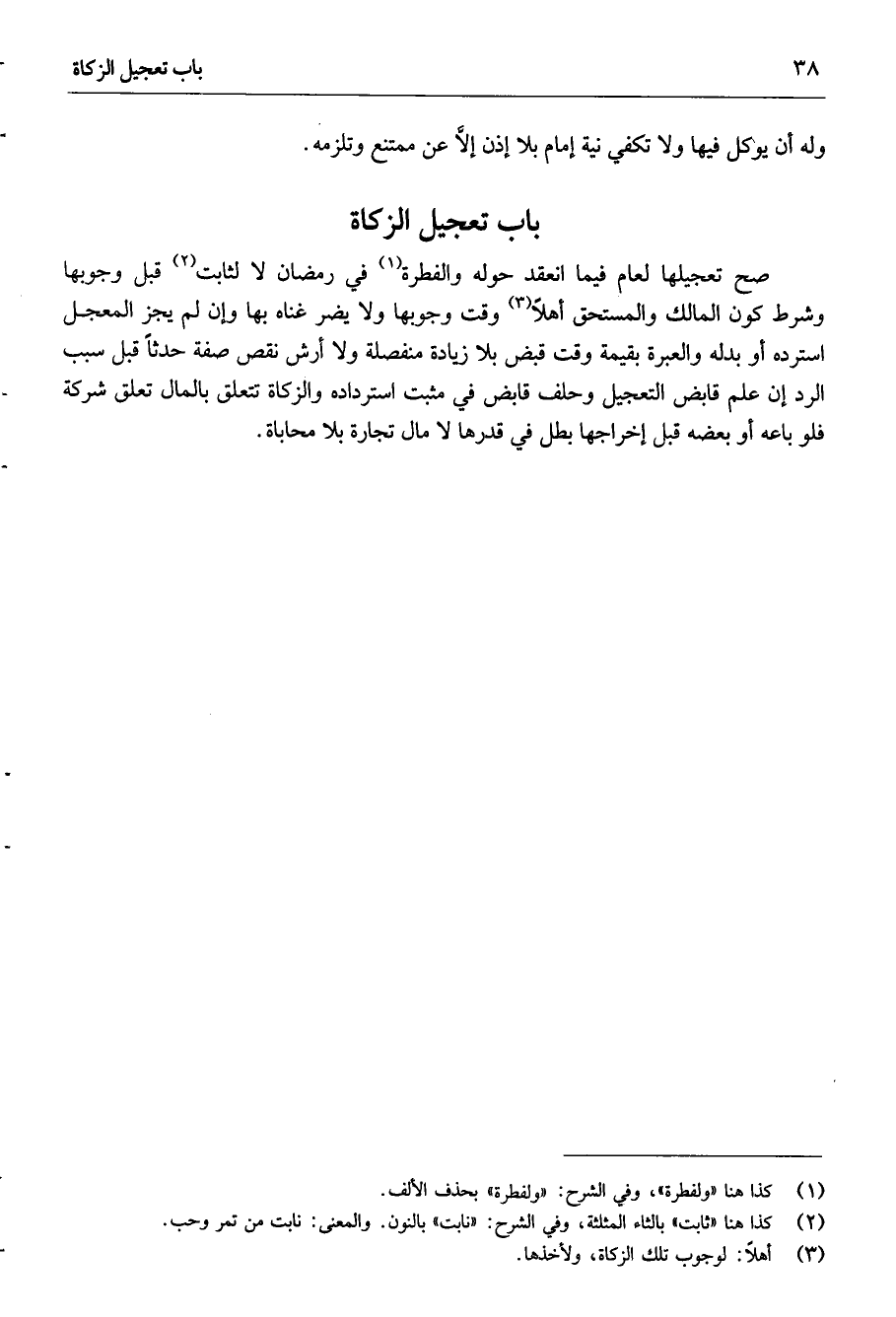 صح تعجيلها لعام فيما انعقد حوله والفطرة1 في رمضان لا لنابت2 قبل وجوبها وشرط كون المالك والمستحق أهلا3 وقت وجوبها ولا يضر غناه بها وإن لم يجر المعجل استرده أو بدله والعبرة بقيمة وقت قبض بلا زيادة منفصلة ولا أرش نقص صفة حدثا قبل سبب الرد إن علم قابض بالتعجيل وحلف قابض في مثبت استرداد والزكاة تتعلق بالمال تعلق شركة فلو باعه أو بعضه قبل إخراجها بطل في قدرها لا مال تجارة بلا محاباة.