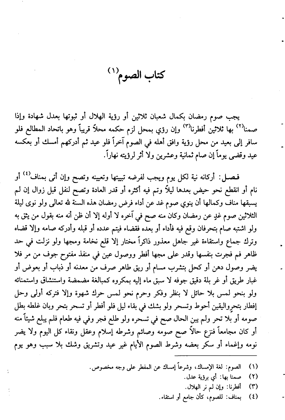 يجب صوم رمضان بكما شعبان ثلاثين أو رؤية الهلال أو ثبوتها بعدل شهادة وإذا صمنا2 بها ثلاثين أفطرنا3 وإن رؤي بمحل لزم حكمه محلا قريبا وهو باتحاد المطلع فلو سافر إلى بعيد من محل رؤية وافق أهله في الصوم آخرا فلو عيد ثم أدركهم أمسك أو بعكسه عيد وقضى يوما إن صام ثمانية وعشرين ولا أثر لرؤيته نهارا.