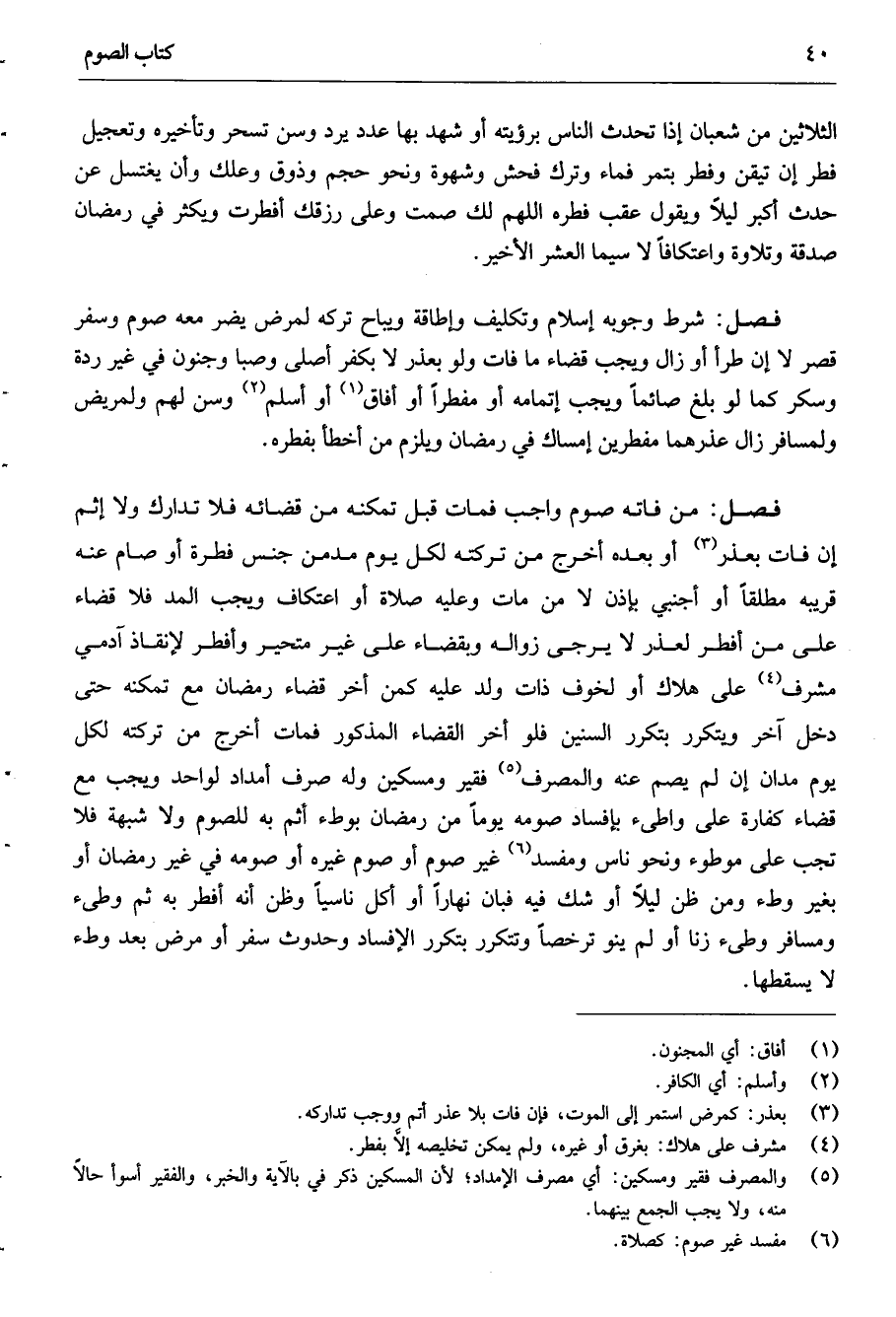 الثلاثين من شعبان إذا تحدث الناس برؤيته أو شهد بها عدد يرد وسن تسحر وتأخيره وتعجيل فطر وإن تيقن وفطر بتمر فماء وترك فحش وشهوة ونحو حجم وذوق وعلك وأن يغتسل عن حدث أكبر ليلا ويقول عقب فطره: اللهم لك صمت وعلى رزقك أفطرت ويكثر في رمضان صدقة وتلاوة واعتكافا لا سيما العشر الأخير.