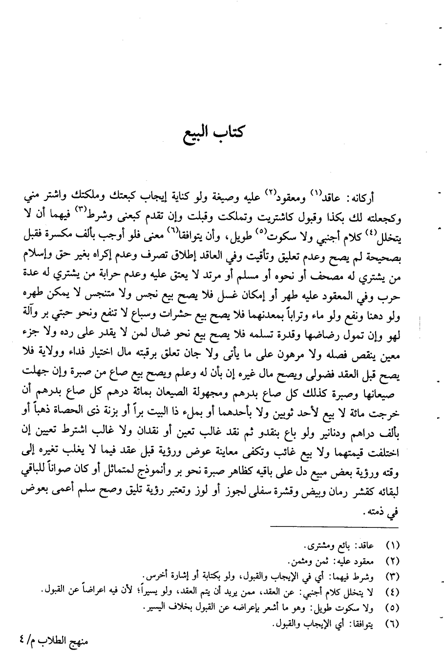 أركانه عاقد1 ومعقود2 عليه وصيغة ولو كناية إيجاب كبعتك وملكتك واشتر مني وكجعلته لك بكذا وقبول كاشتريت وتملكت وقبلت وإن تقدم كبعني وشرط3 فيهما أن لا يتخلل4 كلام أجنبي ولا سكوت5 طويل وأن يتوافقا6 معنى فلو أوجب بألف مكسرة فقبل بصحيحة لم يصح وعدم تعليق وتأقيت وفي العاقد إطلاق تصرف وعدم إكراه بغير حق وإسلام من يشتري له مصحف أو نحوه ومسلم أو مرتد لا يعتق عليه وعدم حرابة من يشتري له عدة حرب وفي المعقود عليه طهر أو إمكان بغسل فلا يصح بيع نجس ولا متنجس لا يمكن طهره ولو دهنا ونفع ولو ماء وترابا بمعدنهما فلا يصح بيع حشرات لا تنفع وسباع لا تنفع ونحو حبتي بر وآلة لهو وإن تمول رضاضها وقدرة تسلمه فلا يصح بيع نحو ضال لمن لا يقدر على رده ولا جزء معين ينقص فصله قيمته ولا مرهون على ما يأتي ولا جان تعلق برقبته مال قبل اختيار فداء وولاية فلا يصح عقد فضولي ويصح بيع مال غيره إن بان له وعلم ويصح بيع صاع من صبرة وإن جهلت صيعانها وصبرة كذلك كل صاع بدرهم ومجهولة الصيعان بمائة درهم كل صاع بدرهم إن خرجت مائة لا بيع لأحد ثوبين ولا بأحدهما أو بملء ذا البيت برا أو بزنة ذي الحصاة ذهبا أو بألف دراهم ودنانير ولو باع بنقد وثم نقد غالب تعين أو نقدان ولا غالب اشترط تعيين إن اختلفت قيمتهما ولا بيع غائب وتكفي معاينة عوض ورؤية قبل عقد فيما لا يغلب تغيره إلى وقته ورؤية بعض مبيع دل على باقيه كظاهر صبرة نحو بر وأنموذج لمتماثل أو كان صوانا للباقي لبقائه كقشر رمان وبيض وقشر سفلى لجوز أو لوز وتعتبر رؤية تليق وصح سلم أعمى بعوض في ذمته.