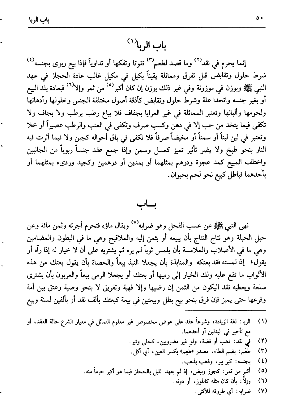 إنما يحرم في نقد2 وما قصد لطعم3 تقوتا أو تفكها أو تداويا فإذا بيع ربوي بجنسه4 شرط حلول وتقابض قبل تفرق ومماثلة يقينا بكيل في مكيل غالب عادة الحجاز في عهد النبي صلى الله عليه وسلم بوزن في موزونه وفي غير ذلك بوزن إن كان أكبر5 من تمر وإلا6 فبعادة بلد البيع وبغير جنسه واتحدا علة شرط حلول وتقايض كأدقة أصول مختلفة الجنس وخلولها وأدهانها ولحومها وألبانها وتعتبر المماثلة في غير العرايا بجفاف فلا يباع رطب برطب ولا بجاف ولا تكفي فيما يتخذ من حب إلا في دهن وكسب صرف وتكفي في العنب والرطب عصيرا أو خلا وتعتبر في لبن لبنا أو سمنا أو مخيضا صرفا فلا تكفي في باقي أحواله كجبن ولا فيما أثرت فيه النار بنحو طبخ ولا يضر تأثير تمييز كعسل وسمن وإذا جمع عقد جنسا ربويا من الجانبين واختلف المبيع كمد عجوة ودرهم بمثلهما أو بمدين أو درهمين وكجيد ورديء بمثلهما أو بأحدهما فباطل كبيع نحو لحم بحيوان.