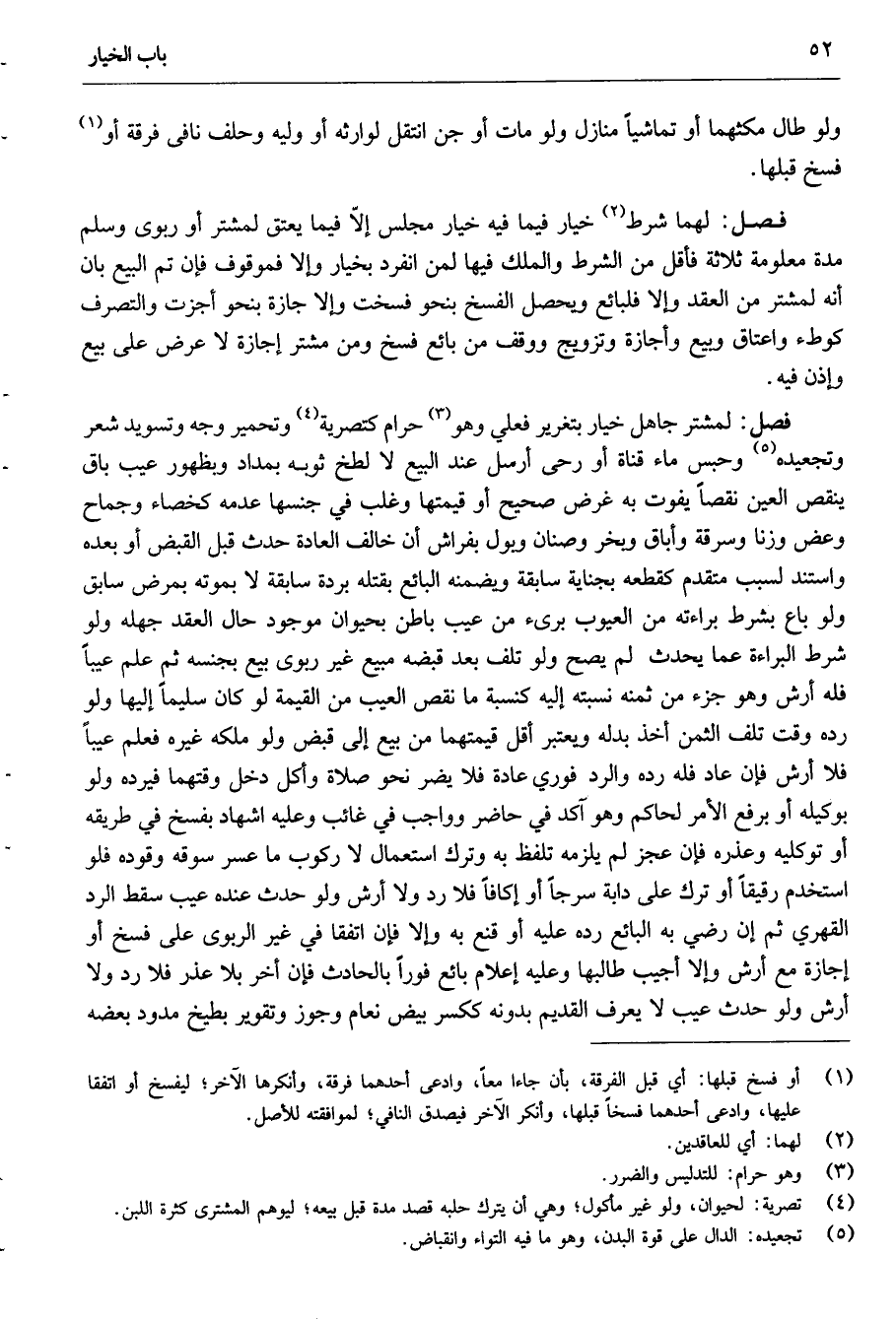 فصل: لمشتر جاهل خيار بتغرير فعلي وهو3 حرام كتصرية4 وتحمير وجه وتسويد شعر وتجعيده5 وحبس ماء قناة أو رحى أرسل عند البيع لا لطخ ثوبه بمداد وبظهور عيب باق ينقص العين نقصا يفوت به غرض صحيح أو قيمتهما وغلب في جنسها عدمه كخصاء وجماح وعض وزنا وسرقة وإباق وبخر وصنان وبول بفراش إن خالف العادة أحدث قبل القبض أو بعده واستند لسبب متقدم كقطعه بجناية سابقة ويضمنه البائع بقتله بردة سابقة لا بموته بمرض سابق ولو باع بشرط براءته من العيوب برئ عن عيب باطن بحيوان موجود حال العقد جهله ولو شرط البراءة عما يحدث لم يصح ولو تلف بعد قبضه مبيع غير ربوي بيع بجنسه ثم علم عيبا فله أرش وهو جزء من ثمنه نسبته إليه كنسبة ما نقص العيب من القيمة لو كان سليما إليها ولو رده وقد تلف الثمن أخذ بدله ويعتبر أقل قيمتها من بيع إلى قبض ولو ملكه غيره فعلم عيبا فلا أرش فإن عاد فله رده والرد فوري عادة فلا يضر نحو صلاة وأكل دخل وقتهما فيرده ولو بوكيله أو يرفع الأمر لحاكم وهو آكد في حاضر وواجب في غائب وعليه إشهاد بفسخ في طريقه أو توكيله أو عذره فإن عجز لم يلزمه تلفظ به وترك استعمال لا ركوب ما عسر سوقه وقوده فلو استخدم رقيقا أو ترك على دابة سرجا أو إكافا فلا رد ولا أرش ولو حدث عنده عيب سقط الرد القهري ثم إن رضي به البائع رده عليه أو قنع به وإلا فإن اتفقا في غير الربوي على فسخ أو إجارة مع أرش وإلا أجيب طالبها وعليه اعلام بائع فورا بالحادث فإن أخر بلا عذر فلا رد ولا أرش ولو حدث عيب لا يعرف القديم بدونه ككسر بيض نعام وجوز وتقوير بطيخ مدود بعضه