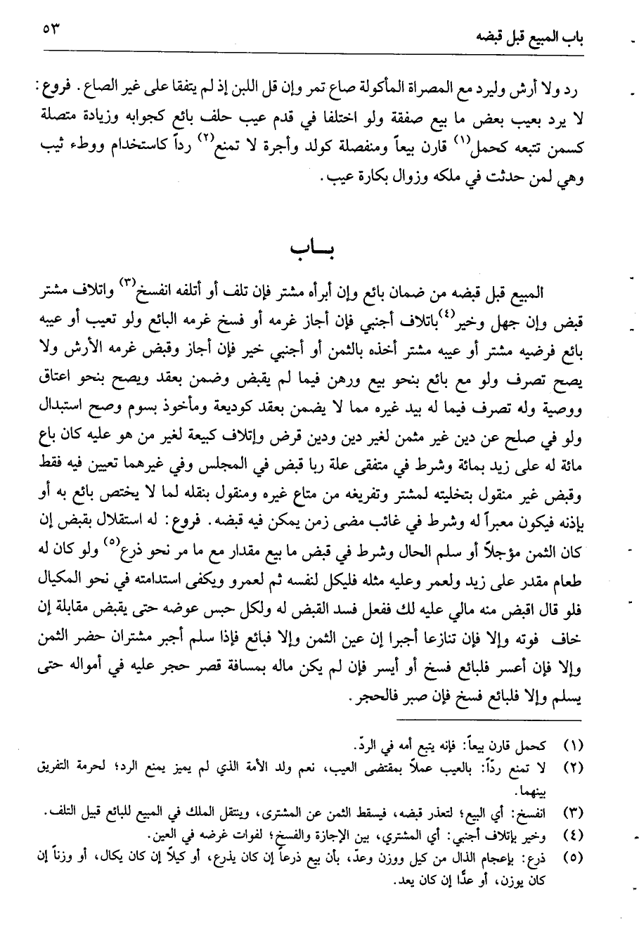 رد ولا أرش وليرد مع المصراة المأكولة صاع تمر وإن قل اللبن إذا لم يتفقا على غير الصاع فروع لا يرد بعيب بعض ما بيع صفقة ولو اختلفا في قدم عيب حلف بائع كجوابه وزيادة متصلة كسمن تتبعه كحمل1 قارن بيعا ومنفصلة كولد وأجرة لا تمنع2 ردا كاستخدام ووطء ثيب وهي لمن حدثت في ملكه وزوال بكارة عيب.