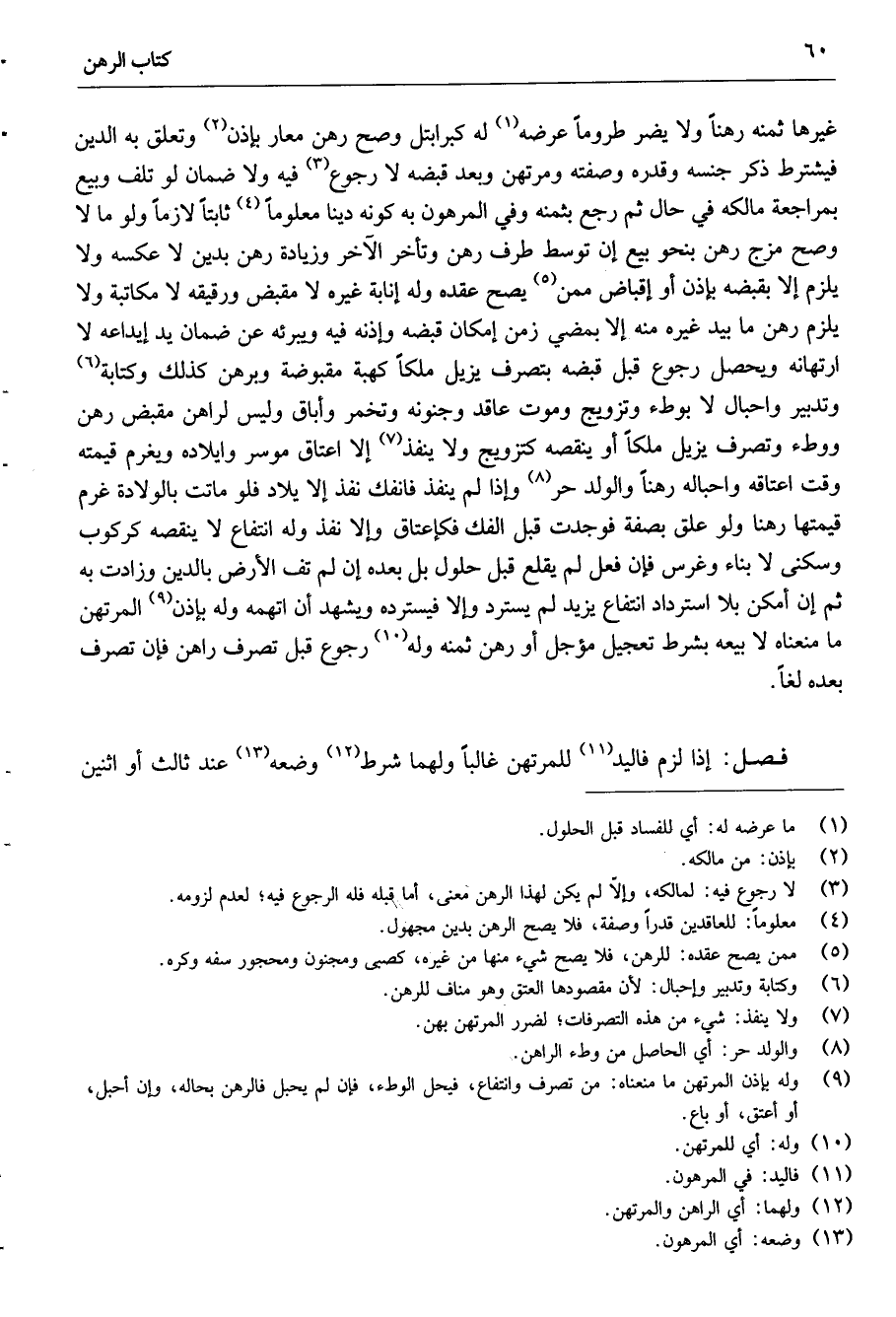غيرها ثمنه رهنا ولا يضر طرو ما عرضه1 له كبر ابتل وصح رهن معار بإذن2 وتعلق به الدين فيشترط ذكر جنسه وقدره وصفته ومرتهن وبعد قبضه لا رجوع3 فيه لمالكه ولا ضمان لو تلف وبيع بمراجعة مالكه في حال ثم رجع بثمنه وفي المرهون به كونه دينا معلوما4 ثابتا لازما ولو مآلا وصح مزج رهن بنحو بيع إن توسط طرف رهن وتأخر الآخر وزيادة رهن بدين لا عكسه ولا يلزم إلا بقبضه بإذن أو إقباض ممن5 يصح عقده وله إنابة غيره لا مقبض ورقيقه إلا مكاتبه ولا يلزم رهن ما بيد غيره منه إلا بمضي زمن إمكان قبضه وإذنه فيه ويبرأ به عن ضمان يد إيداعه لا ارتهانه ويحصل رجوع قبل قبضه بتصرف يزيل ملكا كهبة مقبوضة وبرهن كذلك وكتابة6 وتدبير وإحبال لا بوطء وتزويج وموت عاقد وجنونه وتخمر وإباق وليس لراهن مقبض رهن ووطء وتصرف يزيل ملكا أو ينقصه كتزويج ولا ينفذ7 إلا إعتاق موسر وإيلاده ويغرم قيمته وقت إعتاقه وإحباله رهنا والولد حر8 وإذا لم ينفذا فانفك نفذ الإيلاد فلو ماتت بالولادة غرم قيمتها رهنا ولو علق بصفة فوجدت قبل الفك فكإعتاق وإلا نفذ وله انتفاع لا ينقصه كركوب وسكنى لا بناء وغراس فإن فعل لم يقلع قبل حلول بل بعده إن لم تف الأرض بالدين وزادت به ثم إن أمكن بلا استرداد انتفاع يريده لم يسترد وإلا فيسترد ويشهد إن اتهمه وله بإذن9 المرتهن ما منعناه لا بيعه بشرط تعجيل مؤجل أو رهن ثمنه وله10 رجوع قبل تصرف راهن فإن تصرف بعده لغا.