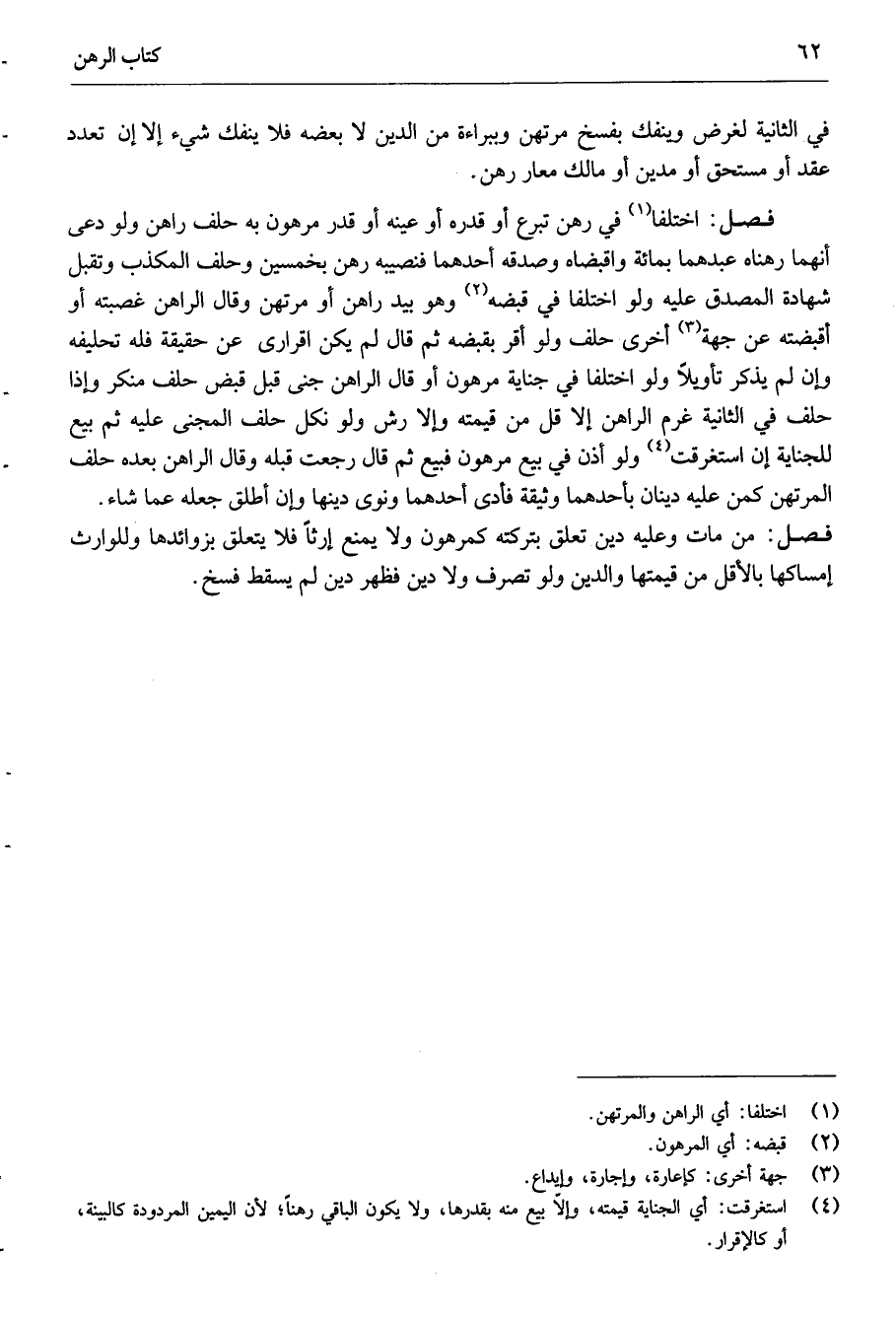 في الثانية لغرض وينفك بفسخ مرتهن وببراءة من الدين لا بعضه فلا ينفك شيء إلا إن تعدد عقد أو مستحق أو مدين أو مالك معار رهن.