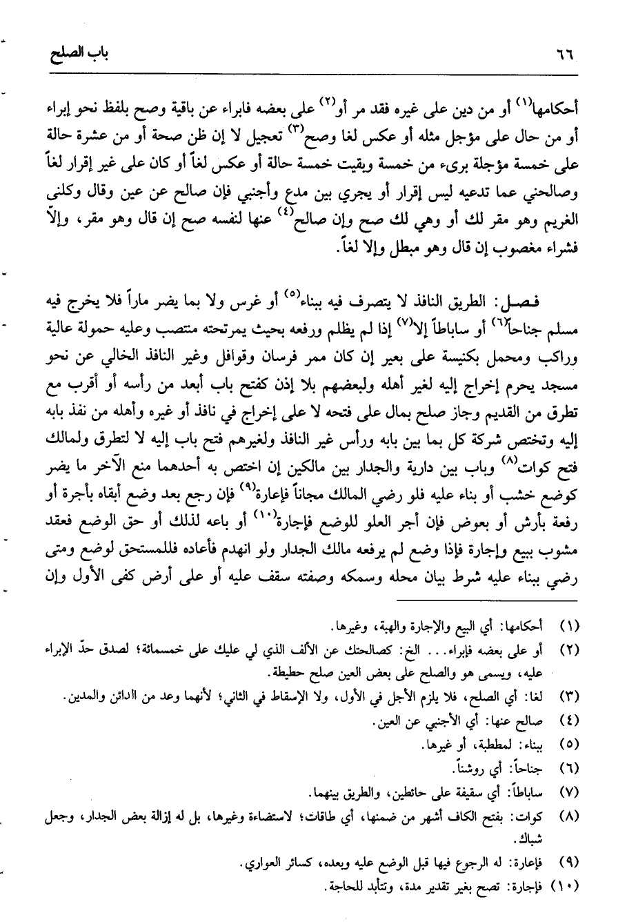 فصل: الطريق النافذ لا يتصرف فيه ببناء5 أو غرس ولا بما يضر مارا فلا يخرج فيه مسلم جناحا6 أو ساباطا إلا7 إذا لم يظلم ورفعه بحيث يمر تحته منتصب وعليه حمولة عالية وراكب ومحمل بكنيسة على بعير إن كان ممر فرسان وقوافل وغير النافذ الخالي عن نحو مسجد يحرم إخراج إليه لغير أهله ولبعضهم بلا إذن كفتح باب أبعد من رأسه أو أقرب مع تطرق من القديم وجاز صلح بمال على فتحه لا على إخراج في نافذ أو غيره وأهله من نفذ بابه إليه وتختص شركة كل بما بين بابه ورأس غير النافذ ولغيرهم فتح باب إليه لا لتطرق ولمالك فتح كوات8 وباب بين داريه والجدار بين مالكين إن اختص به أحدهما منع الآخر ما يضر كوضع خشب أو بناء عليه فلو رضي المالك مجانا فإعارة9 فإن رجع بعد وضع أبقاه بأجرة أو رفعه بأرش أو بعوض فإن أجر العلو للوضع فإجارة10 أو باعه لذلك أو حق الوضع فهو عقد مشوب ببيع وإجارة فإذا وضع لم يرفعه مالك الجدار ولو انهدم فأعاده فللمستحق الوضع ومتى رضي ببناء عليه شرط بيان محله وسمكه وصفته وصفة سقف عليه أو على أرض كفى الأول وإن