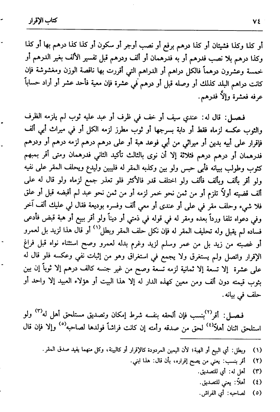 فصل: لو قال: عندي سيف أو خف في ظرف أو عبد عليه ثوب لم يلزمه الظرف والثوب أو عكسه لزماه فقط أو دابة بسرجها أو ثوب مطرز لزمه الكل أو في ميراث أبي ألف فإقرار على أبيه بدين أو ميراثي من أبي فوعد هبة أو على درهم درهم لزمه درهم أو ودرهم فدرهمان أو ودرهم ودرهم فثلاثة إلا إن نوى بالثالث تأكيد الثاني فدرهمان ومتى أقر بمبهم كثوب وطولب ببيانه فأبى حبس ولو بين وكذبه المقر له فليبين وليدع ويحلف المقر على نفيه ولو أقر بألف وبألف فألف ولو اختلف قدر فالأكثر فلو تعذر جمع لزماه ولو قال: له على ألف قضيته أو لا تلزم أو من ثمن نحو خمر لزمه أو من ثمن عبد لم أقبضه قبل أو علق فلا شيء وحلف مقر في علي أو عندي أو معي ألف وفسره بوديعة فقال: لي عليك ألف آخر وفي دعواه تلفا أوردا بعده ومقر له في قوله في ذمتي أو دينا ولو أقر ببيع أو هبة وقبض فيها فادعى فساده لم يقبل وله تحليف المقر له فإن نكل حلف المقر وبطل1 أو قال: هذا لزيد بل لعمرو أو غصبته من زيد بل من عمر وسلم لزيد وغرم بدله لعمرو وصح استثناء نواه قبل فراغ الإقرار واتصل ولم يستغرق ولا يجمع في استغراق وهو من إثبات نفي وعكسه فلو قال: له علي عشرة إلا تسعة إلا ثمانية لزمه تسعة وصح من غير جنسه كألف درهم إلا ثوبا إن بين بثوب قيمته دون ألف وصح من معين كهذه الدار له إلا هذا البيت أو هؤلاء العبيد له إلا واحدا وحلف في بيانه.