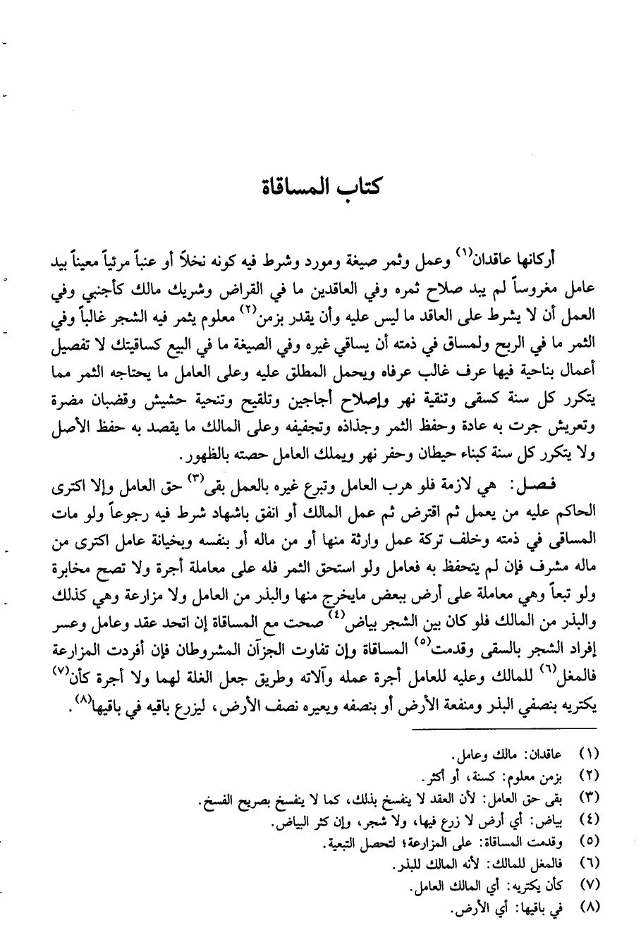أركانها عاقدان1 وعمل وثمر وصيغة ومورد وشرط فيه كونه نخلا أو عنبا مرئيا معينا بيد عامل مغروسا لم يبد صلاح ثمره وفي العاقدين ما مر في القراض وشريك مالك كأجنبي وفي العمل أن لا يشرط على العاقد ما ليس عليه كأن شرط على العامل أن يبني جدارا أو على المالك تنقية النهر وأن يقدر بزمن2 معلوم يثمر فيه الشجر غالبا وفي الثمر ما في للربح ولمساقي في ذمته أن يساقي غيره وفي الصيغة ما في البيع كساقيتك لا تفصيل أعمال بناحية بها عرف غالب عرفاه ويحمل المطلق عليه وعلى العامل ما يحتاجه الثمر مما يتكرر كل سنة كسقي وتنقية نهر وإصلاح أجاجين وتلقيح وتنحية حشيش وقضبان مضرة وتعريش جرت به عادة وحفظ الثمر وجذاذه وتجفيفه وعلى المالك ما يقصد به حفظ الأصل ولا يتكرر كل سنة كبناء حيطان وحفر نهر ويملك العامل حصته بالظهور.