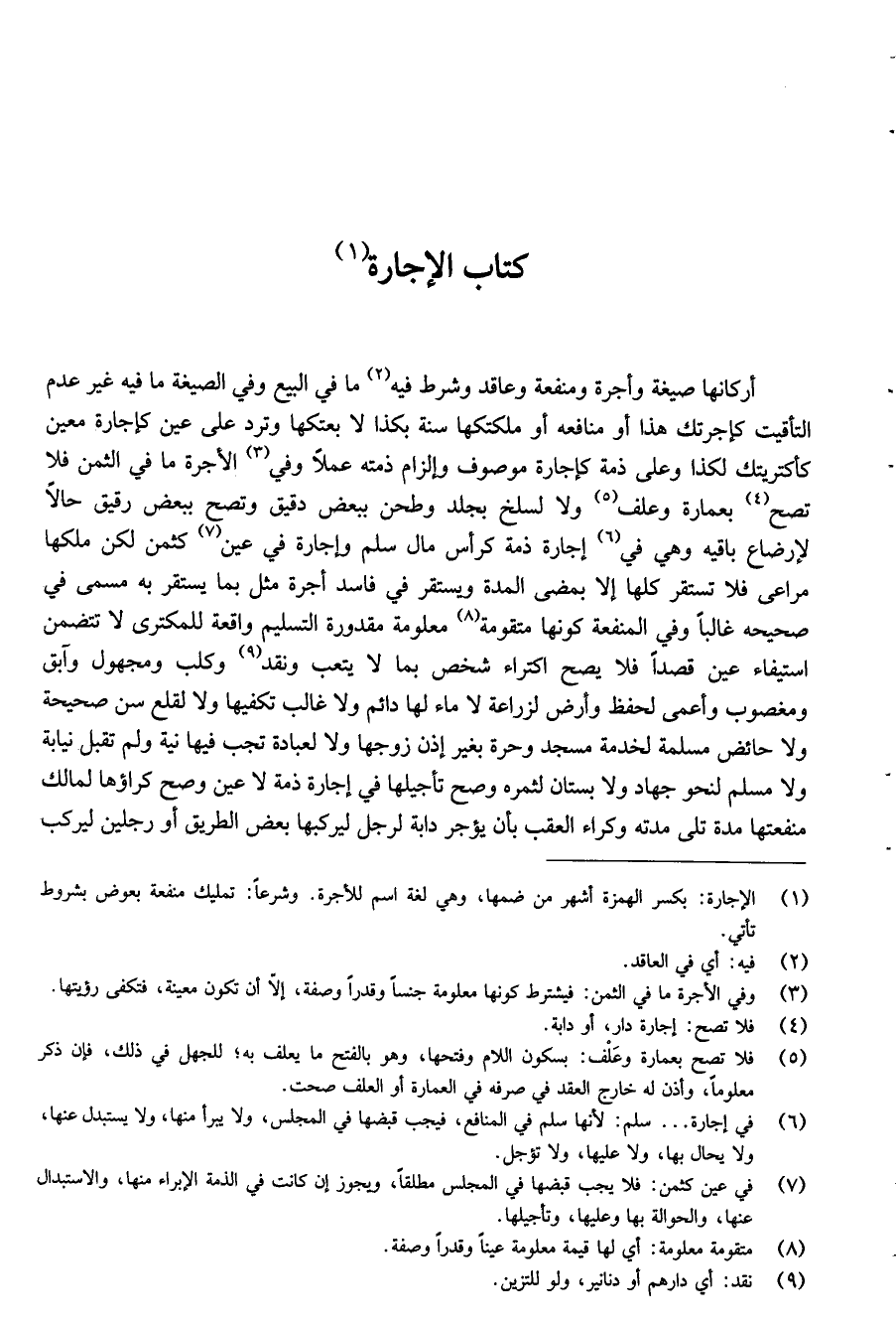 1 الإجارة: بكسر الهمزة أشهر من ضمها وهي لغة اسم للأجرة وشرعا: تمليك منفعة بعوض بشروط تأتي.