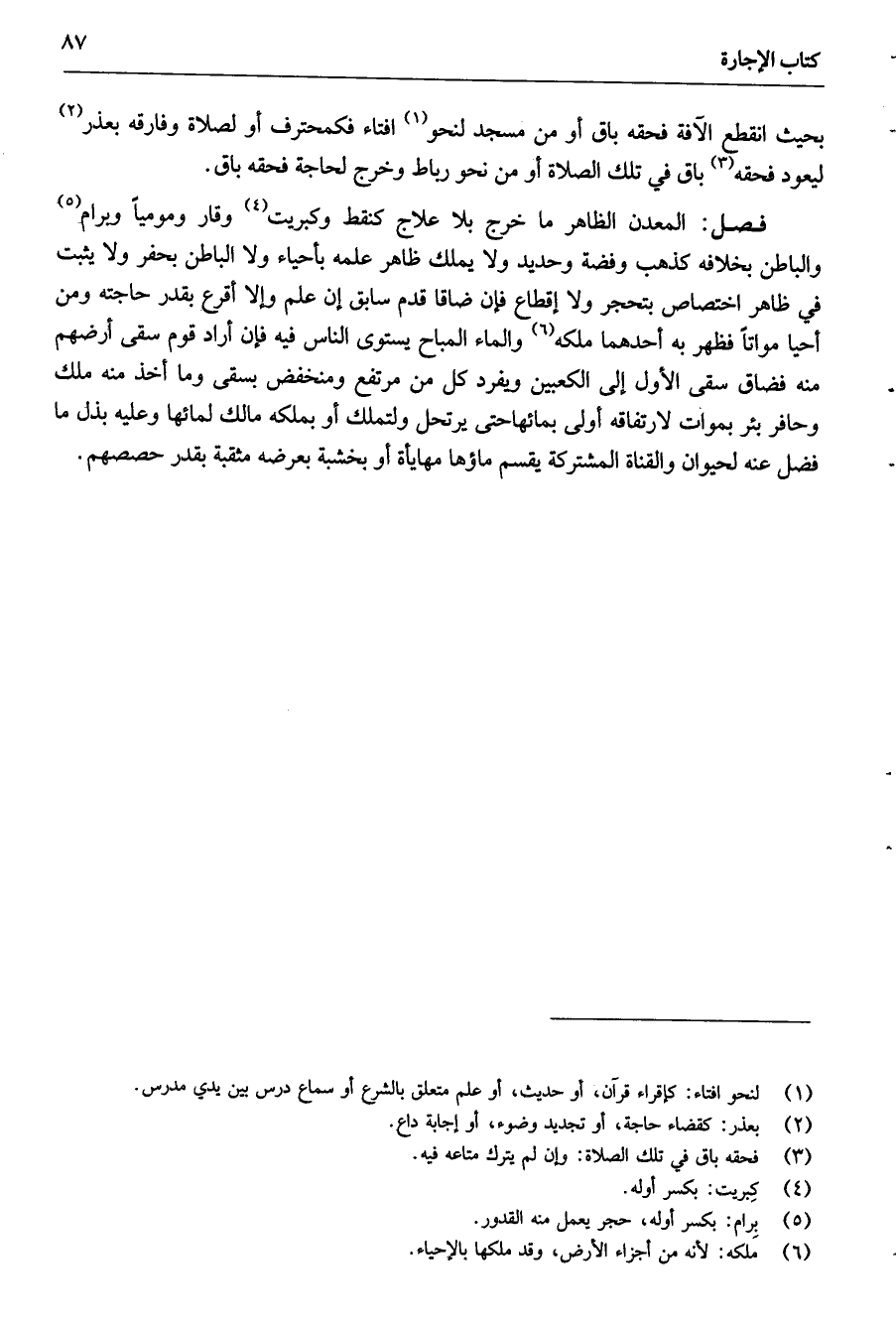 فصل: المعدن الظاهر ما خرج بلا علاج كنفط وكبريت4 وقار وموميا وبرام5 والباطن بخلافه كذهب وفضة وحديد ولا يملك ظاهر علمه بإحياء ولا الباطن بحفر ولا يثبت في ظاهر اختصاص بتحجر ولا إقطاع فإن ضاقا قدم سابق إن علم وإلا أقرع بقدر حاجته ومن أحيا مواتا فظهر به أحدهما ملكه6 والماء المباح يستوي الناس فيه فإن أراد قوم سقي أرضهم منه فضاق سقي الأول إلى الكعبين ويفرد كل من مرتفع ومنخفض بسقي وما أخذ منه ملك وحافر بئر بموات لارتفاقه أولى بمائها حتى يرتحل ولتملك أو بملكه مالك لمائها وعليه بذل ما فضل عنه لحيوان والقناة المشتركة يقسم ماؤها مهايأة أو بخشبة بعرضه مثقبة بقدر حصصهم.