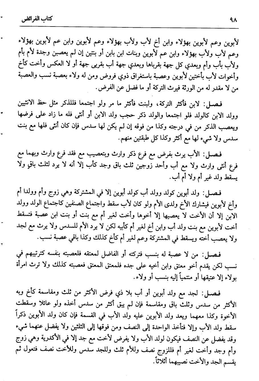 لأبوين وعم لأبوين بهؤلاء وعم وابن أخ لأب ولأب بهؤلاء وعم لأبوين وابن عم لأبوين بهؤلاء وعم لأب ولأب بهؤلاء وابن عم لأبوين وبنات ابن بابن أو بنتين إن لم يعصبن وجدة لأم بأم ولأب بأب وأم وبعدى كل جهة بقرباها وبعدى جهة أب بقربى جهة أم لا العكس وأخت كأخ وأخوات لأب بأختين لأبوين وعصبة باستغراق ذوي فروض ومن له ولاء بعصبة نسب والعصبة من لا مقدر له من الورثة فيرث التركة أو ما فضل عن الفرض.