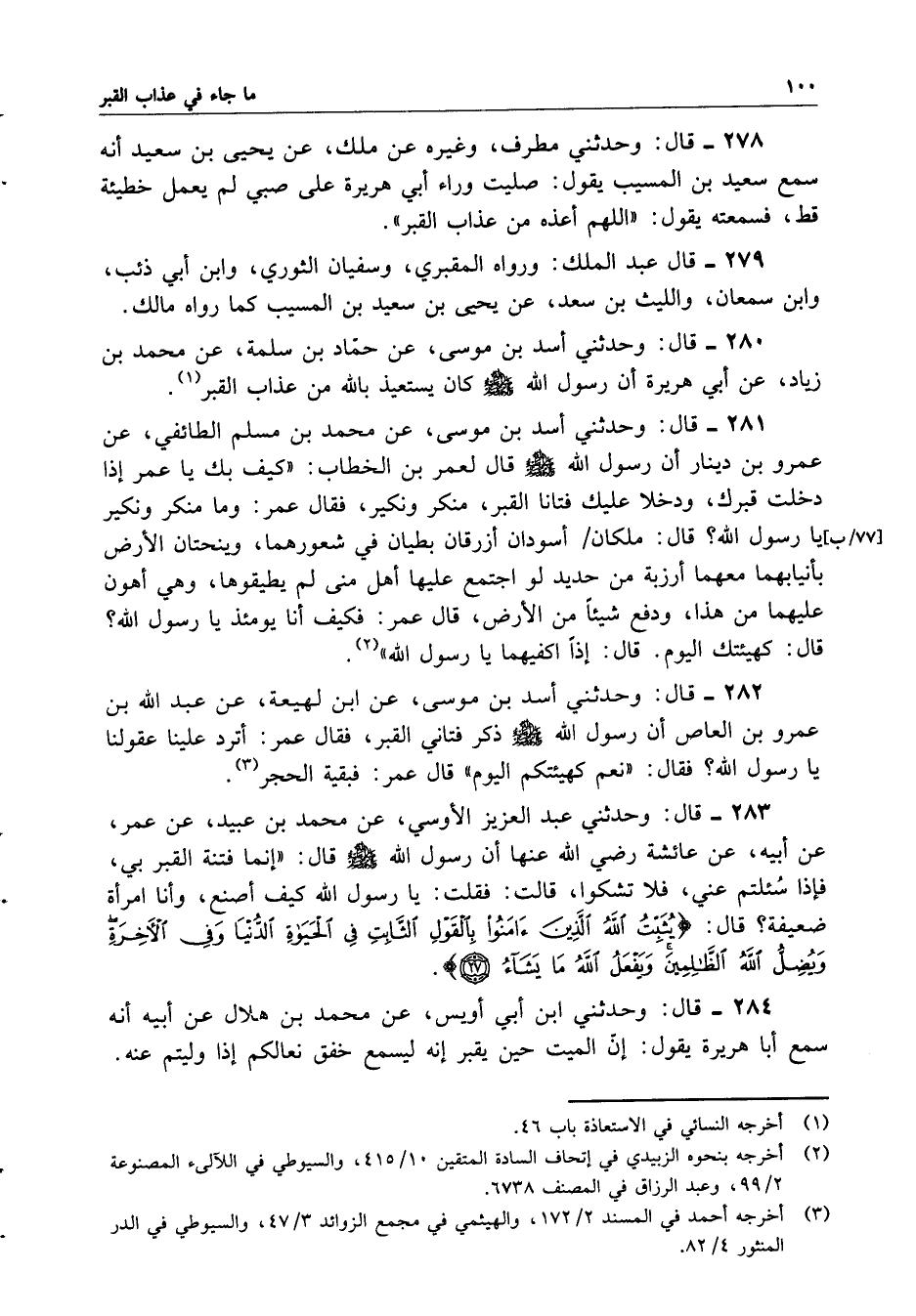 282- قال: وحدثني أسد بن موسى، عن ابن لهيعة، عن عبد الله بن عمرو بن العاص أن رسول الله صلى الله عليه وسلم ذكر فتاني القبر، فقال عمر: أترد علينا عقولنا يا رسول الله؟ فقال: ((نعم كهيئتكم اليوم)) قال عمر: فبقية الحجر.