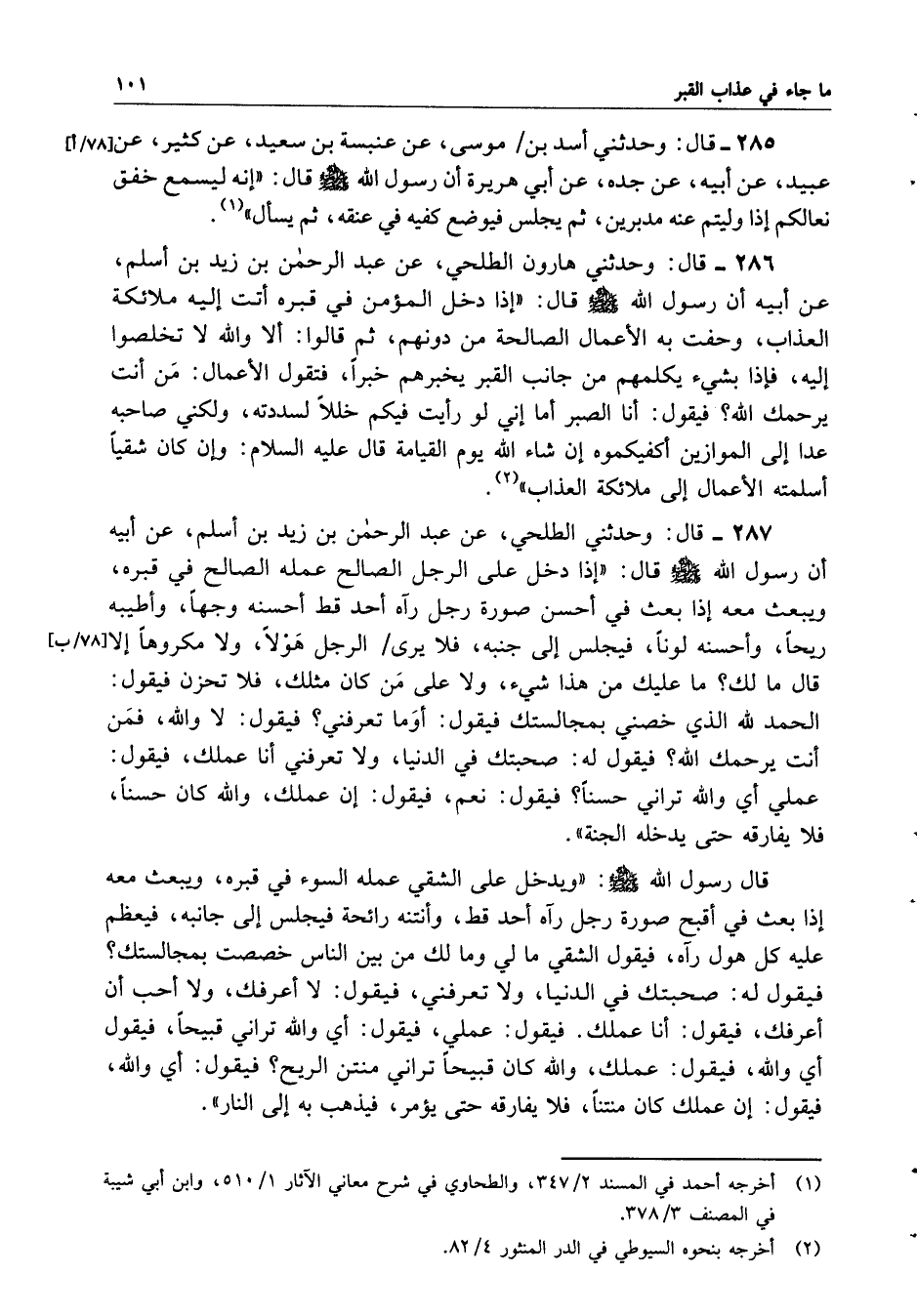 286- قال: وحدثني هارون الطلحي، عن عبد الرحمن بن زيد بن أسلم، عن أبيه أن رسول الله صلى الله عليه وسلم قال: ((إذا دخل المؤمن في قبره أتت إليه ملائكة العذاب، وحفت به الأعمال الصالحة من دونهم، ثم قالوا: ألا والله لا تخلصوا إليه، فإذا بشيء يكلمهم من جانب القبر يخبرهم خبراً، فتقول الأعمال: من أنت يرحمك الله؟ فيقول: أنا الصبر أما إني لو رأيت فيكم خللاً لسددته، ولكني صاحبه عدا إلى الموازين أكفيكموه إن شاء الله يوم القيامة قال عليه السلام: وإن كان شقياً أسلمته الأعمال إلى ملائكة العذاب)).