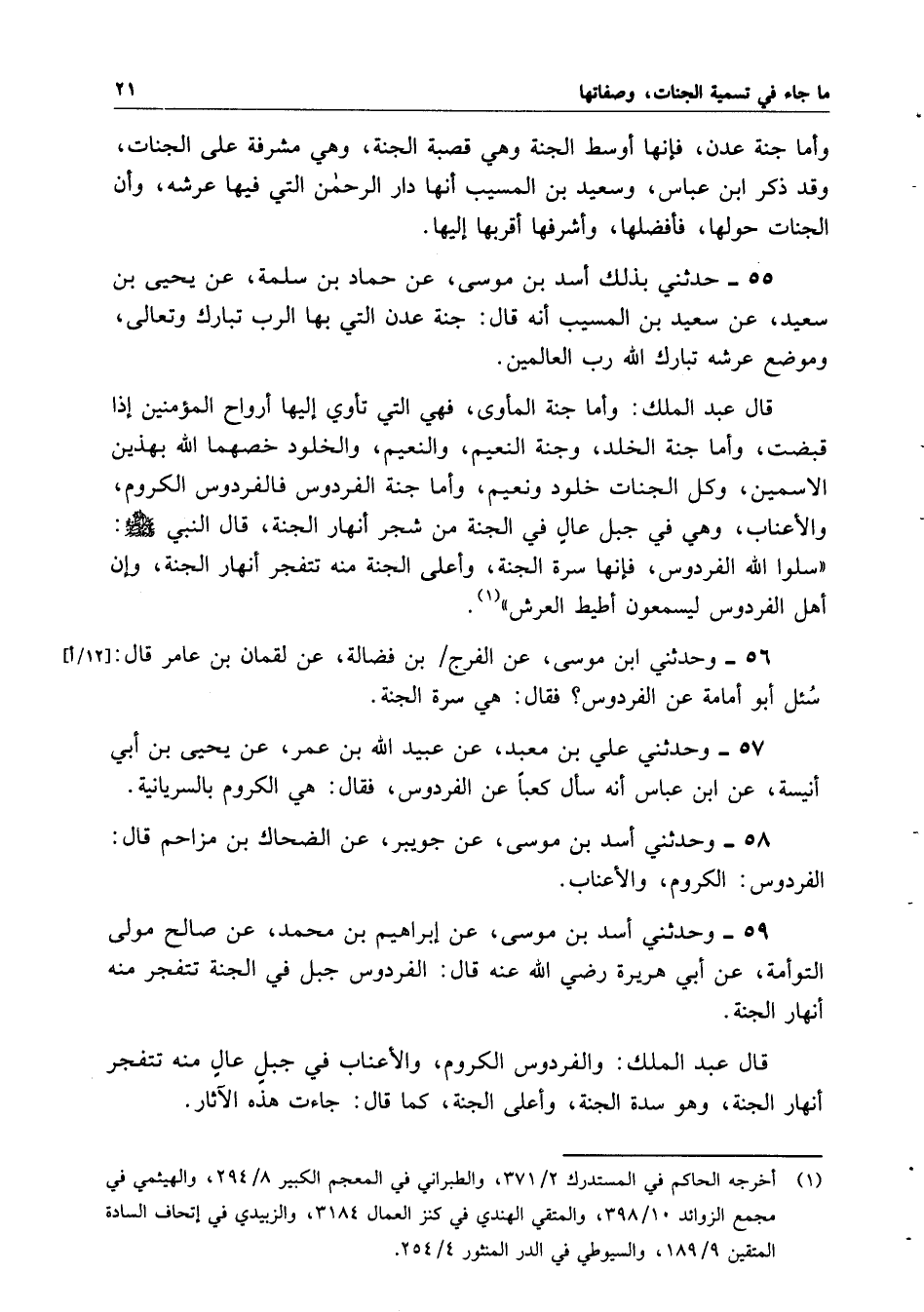 59- وحدثني أسد بن موسى، عن إبراهيم بن محمد، عن صالح مولى التوأمة، عن أبي هريرة رضي الله عنه قال: الفردوس جبل في الجنة تنفجر منه أنهار الجنة.