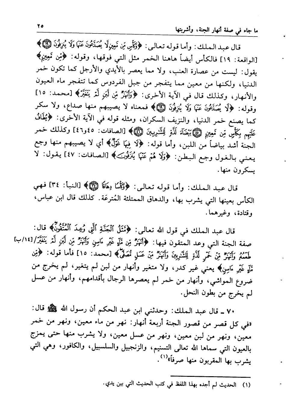 70- قال عبد الملك: وحدثني ابن عبد الحكم أن رسول الله صلى الله عليه وسلم قال: ((في كل قصر من قصور الجنة أربعة أنهار: نهر من ماء معين، ونهر من خمر معين، ونهر من لبن معين، ونهر من عسل معين، ولا يشرب منها حتى يمزج بالعيون التي سماها الله تعالى التسنيم، والزنجبيل والسلسبيل، والكافور، وهي التي يشرب بها المقربون منها صرفاً)).