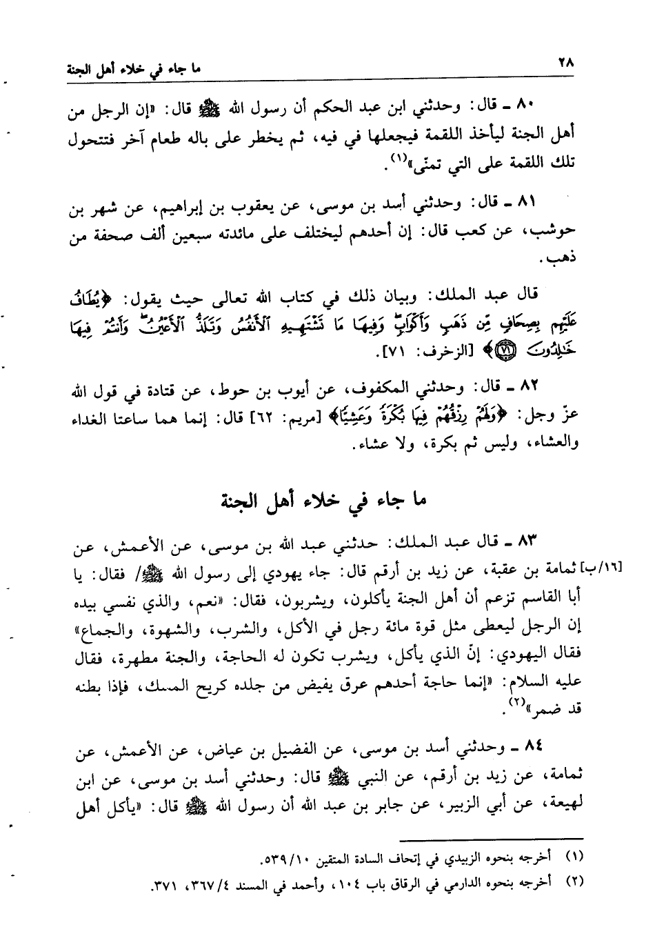 84- وحدثني أسد بن موسى، عن الفضيل بن عياض، عن الأعمش، عن ثمامة، عن زيد بن أرقم، عن النبي صلى الله عليه وسلم قال: وحدثني أسد بن موسى، عن ابن لهيعة، عن أبي الزبير، عن جابر بن عبد الله أن رسول الله صلى الله عليه وسلم قال: ((يأكل أهل