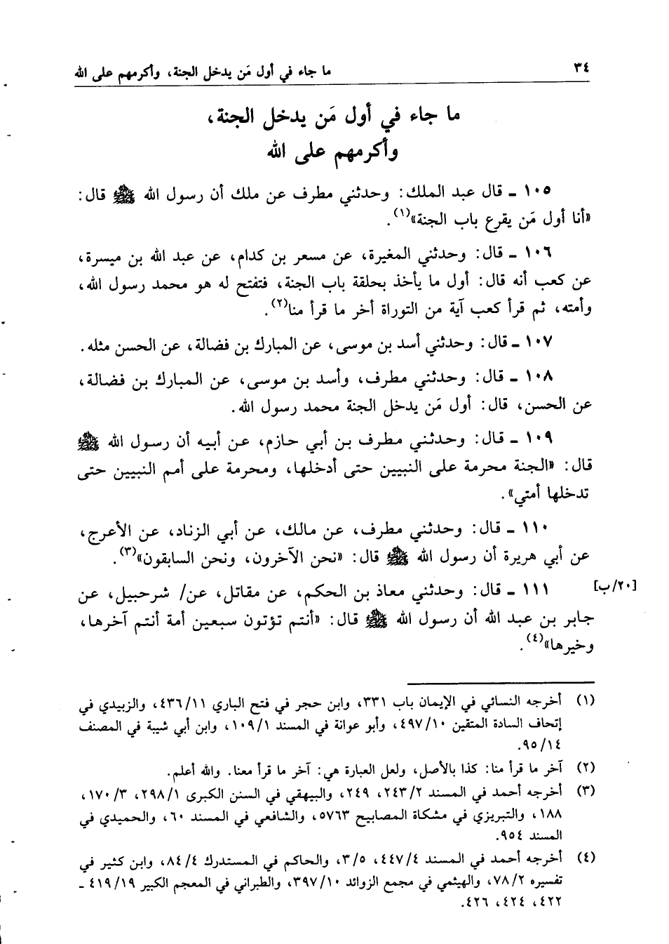 106- قال: وحدثني المغيرة، عن مسعر بن كدام، عن عبد الله بن ميسرة، عن كعب أنه قال: أول ما يأخذ بحلقة باب الجنة، فتفتح له هو محمد رسول الله ، وأمته، ثم قرأ كعب آية من التوراة أخر ما قرأ منا.