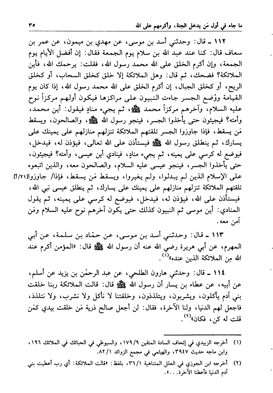 112- قال: وحدثني أسد بن موسى، عن مهدي بن ميمون، عن عمر بن سعاف قال: كنا عند عبد الله بن سلام يوم الجمعة فقال: إن أفضل الأيام يوم الجمعة، وإن أكرم الخلق على الله محمد رسول الله، فقلت: يرحمك الله، فأين الملائكة؟ فضحك، ثم قال: وهل الملائكة إلا خلق كخلق السحاب، أو كخلق الريح، أو كخلق الجبال، إن أكرم الخلق على الله محمد رسول الله، إذا كان يوم القيامة ووضع الجسر جاءت النبيون على مراكزها فيكون أولهم مركزاً نوح عليه السلام، وآخرهم مركزاً محمد صلى الله عليه وسلم ، ثم يجيء منادٍ فيقول: أين محمد، وأمته؟ فيجيئون حتى يأخذوا الجسر، فينجو رسول الله صلى الله عليه وسلم ، والصالحون، ويسقط من يسقط، فإذا جاوزوا الجسر تلقتهم الملائكة تنزلهم منازلهم على يمينك على يسارك، ثم ينطلق رسول الله صلى الله عليه وسلم فيستأذن على الله تعالى، فيؤذن له، فيدخل، فيوضع له كرسي على يمينه، ثم يجيء منادٍ، فينادي أين عيسى، وأمته؟ فيجيئون، حتى يأخذوا الجسر، فينجو عيسى عليه السلام، والصالحون معه، والذين اتبعوه على الإسلام الذين لم يبدلوا، ولم يغيروا، ويسقط من يسقط، فإذا/ جاوزوا تلقتهم الملائكة تنزلهم منازلهم على يمينك على يسارك، ثم ينطلق عيسى نبي الله، فيستأذن على الله، فيؤذن له، فيدخل، فيوضع له كرسي على يمينه، ثم يقول المنادي: أين موسى ثم النبيون كذلك حتى يكون آخرهم نوح عليه السلام ومن آمن معه.