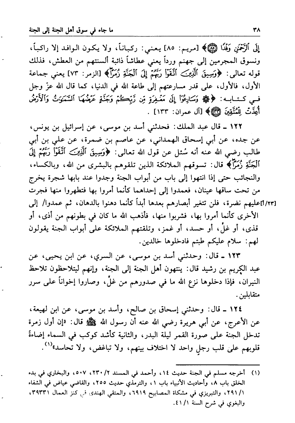 123- قال: وحدثني أسد بن موسى، عن السري، عن ابن يحيى، عن عبد الكريم بن رشيد قال: ينتهون أهل الجنة إلى الجنة، وإنهم ليتلاحظون تلاحظ النيران، فإذا دخلوها نزع الله ما في صدورهم من غل، وصاروا إخواناً على سرر متقابلين.