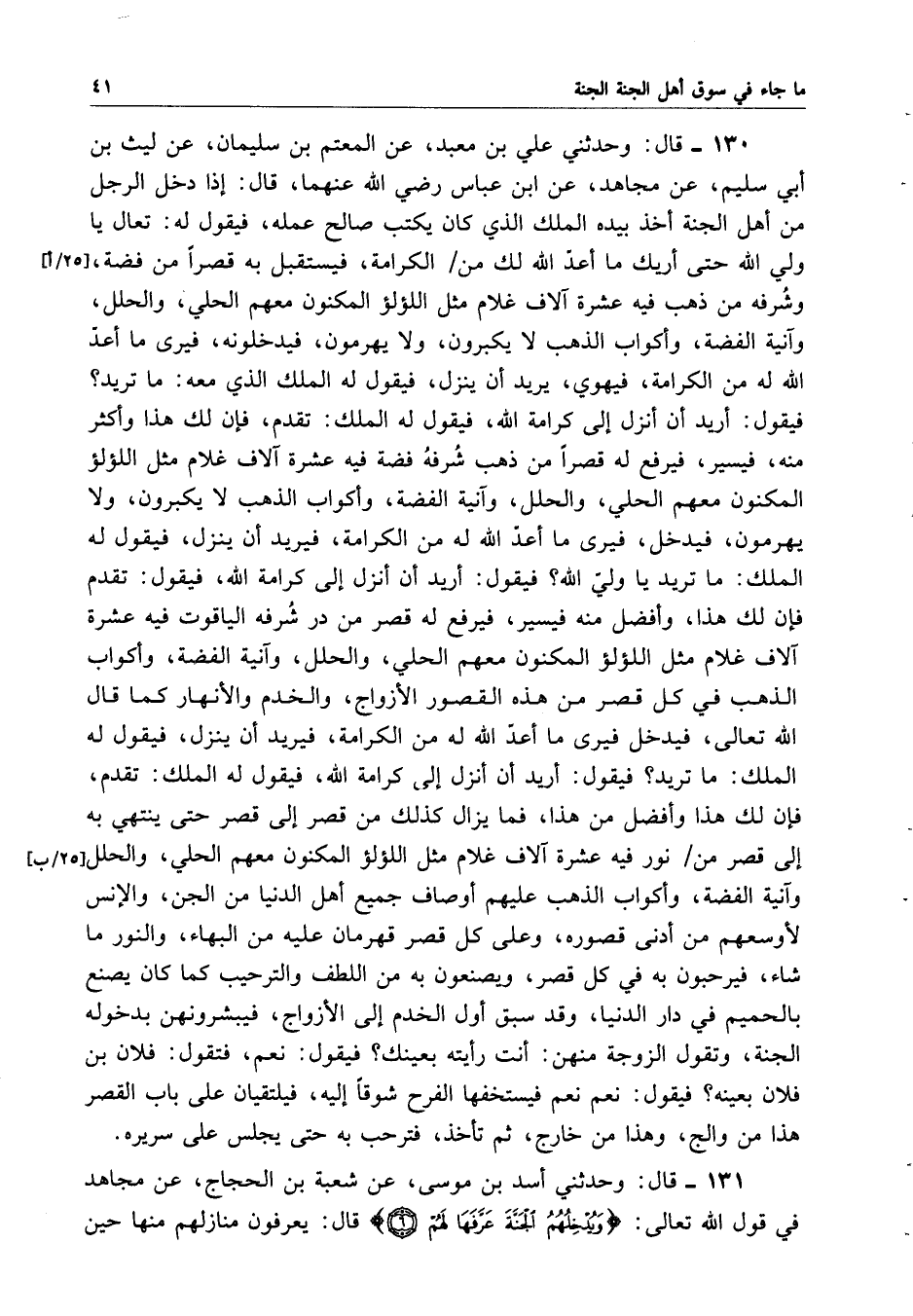 130- قال: وحدثني علي بن معبد، عن المعتم بن سليمان، عن ليث بن أبي سليم، عن مجاهد، عن ابن عباس رضي الله عنهما، قال: إذا دخل الرجل من أهل الجنة أخذ بيده الملك الذي كان يكتب صالح عمله، فيقول له: تعال يا ولي الله حتى أريك ما أعد الله لك من/ الكرامة، فيستقبل به قصراً من فضة، وشرفه من ذهب فيه عشرة آلاف غلام مثل اللؤلؤ المكنون معهم الحلي، والحلل، وآنية الفضة، وأكواب الذهب لا يكبرون، ولا يهرمون، فيدخلونه، فيرى ما أعد الله له من الكرامة، فيهوي، يريد أن ينزل، فيقول له الملك الذي معه: ما تريد؟ فيقول: أريد أن أنزل إلى كرامة الله، فيقول له الملك: تقدم، فإن لك هذا وأكثر منه، فيسير، فيرفع له قصراً من ذهب شرفه فضة فيه عشرة آلاف غلام مثل اللؤلؤ المكنون معهم الحلي، والحلل، وآنية الفضة، وأكواب الذهب لا يكبرون، ولا يهرمون، فيدخل، فيرى ما أعد الله له من الكرامة، فيريد أن ينزل، فيقول له الملك: ما تريد يا ولي الله؟ فيقول: أريد أن أنزل إلى كرامة الله، فيقول: تقدم فإن لك هذا، وأفضل منه فيسير، فيرفع له قصر من در شرفه الياقوت فيه عشرة آلاف غلام مثل اللؤلؤ المكنون معهم الحلي، والحلل، وآنية الفضة، وأكواب الذهب في كل قصر من هذه القصور الأزواج، والخدم والأنهار كما قال الله تعالى، فيدخل فيرى ما أعد الله له من الكرامة، فيريد أن ينزل، فيقول له الملك: ما تريد؟ فيقول: أريد أن أنزل إلى كرامة الله، فيقول له الملك: تقدم، فإن لك هذا وأفضل من هذا، فما يزال كذلك من قصر إلى قصر حتى ينتهي به إلى قصر من/ نور فيه عشرة آلاف غلام مثل اللؤلؤ المكنون معهم الحلي، والحلل وآنية الفضة، وأكواب الذهب عليهم أوصاف جميع أهل الدنيا من الجن، والإنس لأوسعهم من أدنى قصوره، وعلى كل قصر قهرمان عليه من البهاء، والنور ما شاء، فيرحبون به في كل قصر، ويصنعون به من اللطف والترحيب كما كان يصنع بالحميم في دار الدنيا، وقد سبق أول الخدم إلى الأزواج، فيبشرونهن بدخوله الجنة، وتقول الزوجة منهن: أنت رأيته بعينك؟ فيقول: نعم، فتقول: فلان بن فلان بعينه؟ فيقول: نعم نعم فيستخفها الفرح شوقاً إليه، فيلتقيان على باب القصر هذا من والج، وهذا من خارج، ثم تأخذ، فترحب به حتى يجلس على سريره.