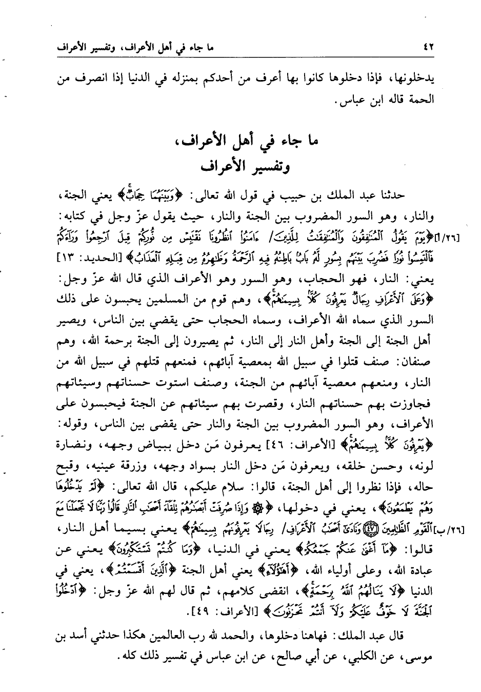 حدثنا عبد الملك بن حبيب في قول الله تعالى: {وبينهما حجاب} يعني الجنة، والنار، وهو السور المضروب بين الجنة والنار، حيث يقول عز وجل في كتابه: {يوم يقول المنافقون والمنافقات للذين/ ءامنوا انظرونا نقتبس من نوركم قيل ارجعوا وراءكم فالتمسوا نوراً فضرب بينهم بسورٍ له باب باطنه فيه الرحمة وظاهره من قبله العذاب} يعني: النار، فهو الحجاب، وهو السور وهو الأعراف الذي قال الله عز وجل: {وعلى الأعراف رجالٌ يعرفون كلاً بسيماهم}، وهم قوم من المسلمين يحبسون على ذلك السور الذي سماه الله الأعراف، وسماه الحجاب حتى يقضي بين الناس، ويصير أهل الجنة إلى الجنة وأهل النار إلى النار، ثم يصيرون إلى الجنة برحمة الله، وهم صنفان: صنف قتلوا في سبيل الله بمعصية آبائهم، فمنعهم قتلهم في سبيل الله من النار، ومنعهم معصية آبائهم من الجنة، وصنف استوت حسناتهم وسيئاتهم فجاوزت بهم حسناتهم النار، وقصرت بهم سيئاتهم عن الجنة فيحبسون على الأعراف، وهو السور المضروب بين الجنة والنار حتى يقضى بين الناس، وقوله: {يعرفون كلاً بسيماهم} يعرفون من دخل ببياض وجهه، ونضارة لونه، وحسن خلقه، ويعرفون من دخل النار بسواد وجهه، وزرقة عينيه، وقبح حاله، فإذا نظروا إلى أهل الجنة، قالوا: سلام عليكم، قال الله تعالى: {لم يدخلوها وهم يطمعون}، يعني في دخولها، {وإذا صرفت أبصارهم تلقاء أصحاب النار قالوا ربنا لا تجعلنا مع القوم الظالمين. ونادى أصحاب الأعراف/ رجالاً يعرفونهم بسيماهم} يعني بسيما أهل النار، قالوا: {ما أغنى عنكم جمعكم} يعني في الدنيا، {وما كنتم تستكبرون} يعني عن عبادة الله، وعلى أولياء الله، {أهؤلاء} يعني أهل الجنة {الذين أقسمتم}، يعني في الدنيا {لا ينالهم الله برحمةٍ}، انقضى كلامهم، ثم قال لهم الله عز وجل: {ادخلوا الجنة لا خوف عليكم ولا أنتم تحزنون}.