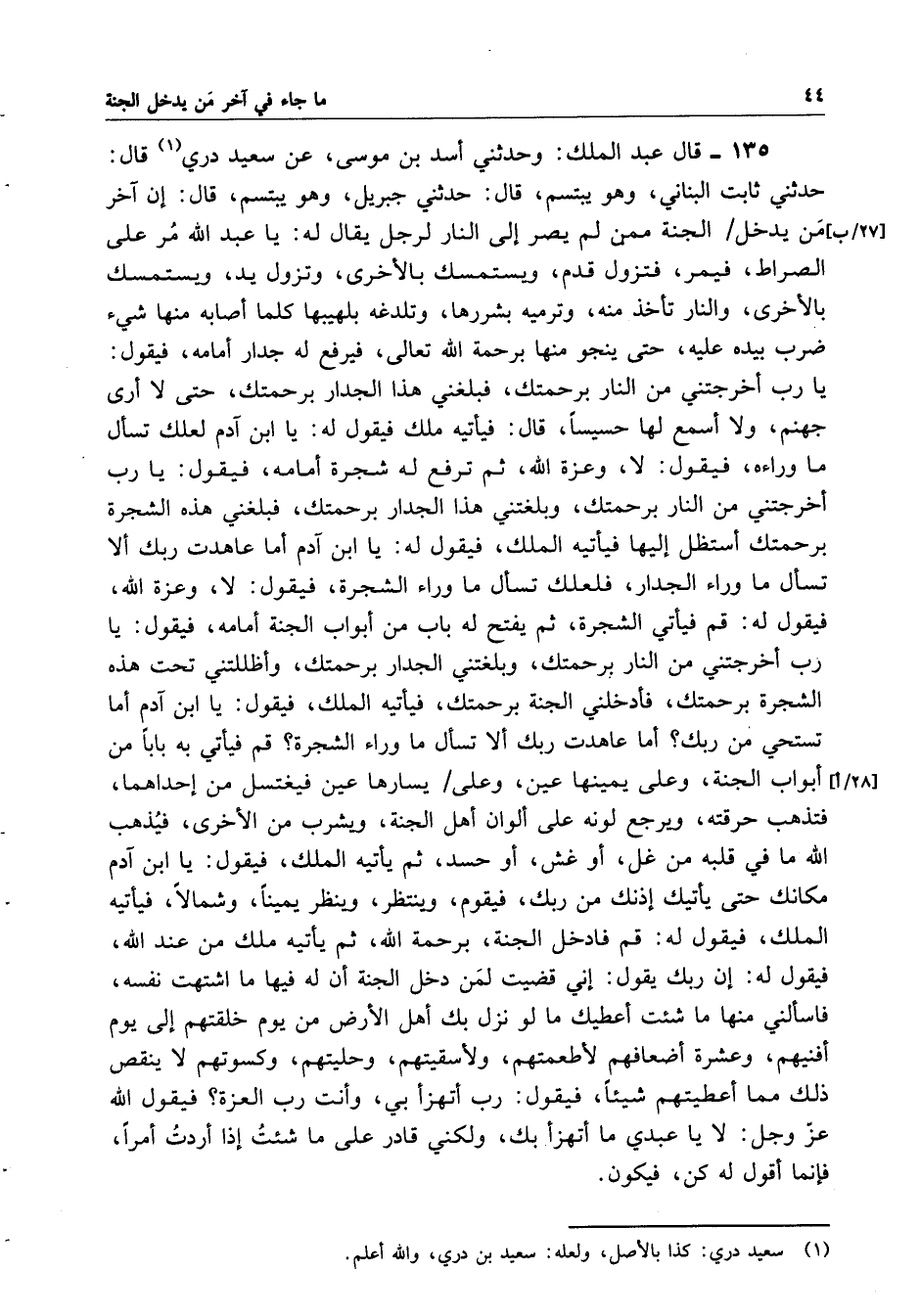 135- قال عبد الملك: وحدثني أسد بن موسى، عن سعيد دري قال: حدثني ثابت البناني، وهو يبتسم، قال: حدثني جبريل، وهو يبتسم، قال: إن آخر من يدخل/ الجنة ممن لم يصر إلى النار لرجل يقال له: يا عبد الله مر على الصراط، فيمر، فتزول قدم، ويستمسك بالأخرى، وتزول يد، ويستمسك بالأخرى، والنار تأخذ منه، وترميه بشررها، وتلدغه بلهيبها كلما أصابه منها شيء ضرب بيده عليه، حتى ينجو منها برحمة الله تعالى، فيرفع له جدار أمامه، فيقول: يا رب أخرجتني من النار برحمتك، فبلغني هذا الجدار برحمتك، حتى لا أرى جهنم، ولا أسمع لها حسيساً، قال: فيأتيه ملك فيقول له: يا ابن آدم لعلك تسأل ما وراءه، فيقول: لا، وعزة الله، ثم ترفع له شجرة أمامه، فيقول: يا رب أخرجتني من النار برحمتك، وبلغتني هذا الجدار برحمتك، فبلغني هذه الشجرة برحمتك أستظل إليها فيأتيه الملك، فيقول له: يا ابن آدم أما عاهدت ربك ألا تسأل ما وراء الجدار، فلعلك تسأل ما وراء الشجرة، فيقول: لا، وعزة الله، فيقول له: قم فيأتي الشجرة، ثم يفتح له باب من أبواب الجنة أمامه، فيقول: يا رب أخرجتني من النار برحمتك، وبلغتني الجدار برحمتك، وأظللتني تحت هذه الشجرة برحمتك، فأدخلني الجنة برحمتك، فيأتيه الملك، فيقول: يا ابن آدم أما تستحي من ربك؟ أما عاهدت ربك ألا تسأل ما وراء الشجرة؟ قم فيأتي به باباً من أبواب الجنة، وعلى يمينها عين، وعلى/ يسارها عين فيغتسل من إحداهما، فتذهب حرقته، ويرجع لونه على ألوان أهل الجنة، ويشرب من الأخرى، فيذهب الله ما في قلبه من غل، أو غش، أو حسد، ثم يأتيه الملك، فيقول: يا ابن آدم مكانك حتى يأتيك إذنك من ربك، فيقوم، وينتظر، وينظر يميناً، وشمالاً، فيأتيه الملك، فيقول له: قم فادخل الجنة، برحمة الله، ثم يأتيه ملك من عند الله، فيقول له: إن ربك يقول: إني قضيت لمن دخل الجنة أن له فيها ما اشتهت نفسه، فاسألني منها ما شئت أعطيك ما لو نزل بك أهل الأرض من يوم خلقتهم إلى يوم أفنيهم، وعشرة أضعافهم لأطعمتهم، ولأسقيتهم، وحليتهم، وكسوتهم لا ينقص ذلك مما أعطيتهم شيئاً، فيقول: رب أتهزأ بي، وأنت رب العزة؟ فيقول الله عز وجل: لا يا عبدي ما أتهزأ بك، ولكني قادر على ما شئت إذا أردت أمراً، فإنما أقول له كن، فيكون.