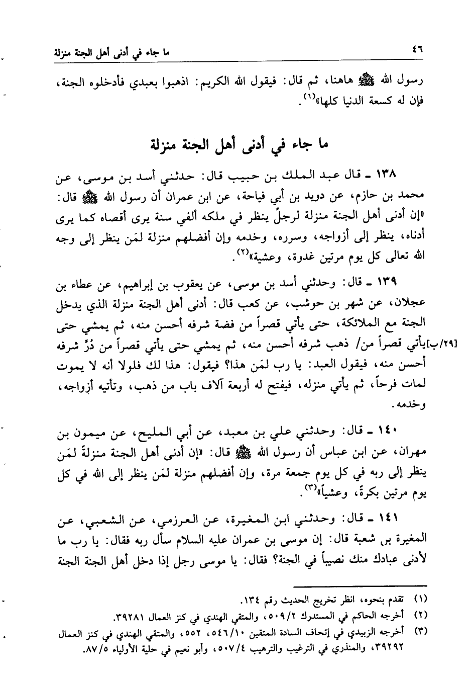 138- قال عبد الملك بن حبيب قال: حدثني أسد بن موسى، عن محمد بن حازم، عن دويد بن أبي فياحة، عن ابن عمران أن رسول الله صلى الله عليه وسلم قال: ((إن أدنى أهل الجنة منزلة لرجلٌ ينظر في ملكه ألفي سنة يرى أقصاه كما يرى أدناه، ينظر إلى أزواجه، وسرره، وخدمه وإن أفضلهم منزلة لمن ينظر إلى وجه الله تعالى كل يوم مرتين غدوة، وعشية)).