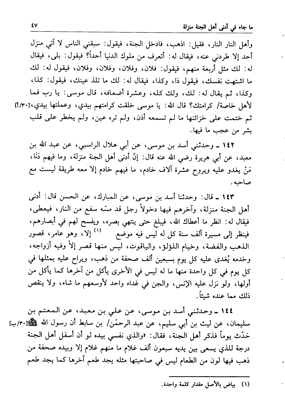 143- قال: وحدثنا أسد بن موسى، عن المبارك، عن الحسن قال: أدنى أهل الجنة منزلة، وآخرهم فيها دخولاً رجل قد مسه سفع من النار، فيعطى، فيقال له: انظر ما أعطاك الله، فيبلغ حتى ينتهي بصره، ويفسح لهم في أبصارهم، فينظر إلى مسيرة ألف سنة كل له ليس فيه موضع إلا، وهو عامر، قصور الذهب والفضة، وخيام اللؤلؤ، والياقوت، ليس منها قصر إلا وفيه أزواجه، وخدمه يغدى عليه كل يوم بسبعين ألف صحفة من ذهب، ويراح عليه بمثلها في كل يوم في كل واحدة منها ما له ليس في الأخرى يأكل من آخرها كما يأكل من أولها، ولو نزل عليه الإنس، والجن في غداء واحد لأوسعهم ما شاء، ولا ينقص ذلك مما عنده شيئاً.