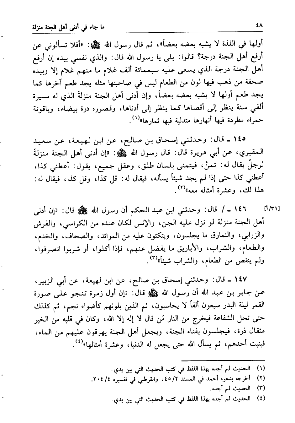 145- قال: وحدثني إسحاق بن صالح، عن ابن لهيعة، عن سعيد المقبري، عن أبي هريرة قال: قال رسول الله صلى الله عليه وسلم : ((إن أدنى أهل الجنة منزلةً لرجلٌ يقال له: تمن، فيتمنى بلسان طلق، وعقل جميع، يقول: أعطني كذا، أعطني كذا حتى إذا لم يجد شيئاً يسأله، فيقال له: قل كذا، وقل كذا فيقال له: هذا لك، وعشرة أمثاله معه)).