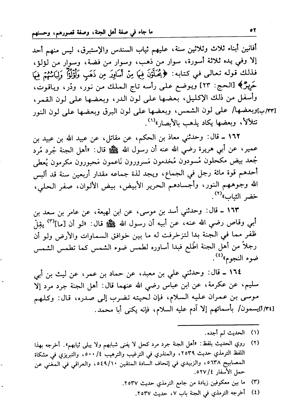 162- قال: وحدثني معاذ بن الحكم، عن مقاتل، عن عبيد الله بن عبيد بن عمير، عن أبي هريرة رضي الله عنه أن رسول الله صلى الله عليه وسلم قال: ((أهل الجنة جرد مرد جعد بيض مكحلون مسودون مخدمون مسرورون ناعمون محبورون مكرمون يعطى أحدهم قوة مائة رجل في الجماع، ويجد لذة جماعه مقدار أربعين سنة قد ألبس الله وجوههم النور، وأجسادهم الحرير الأبيض، بيض الألوان، صفر الحلي، خضر الثياب)).