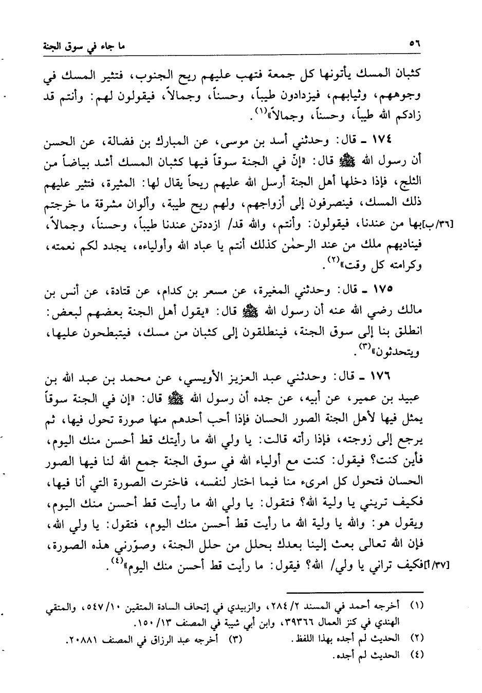 174- قال: وحدثني أسد بن موسى، عن المبارك بن فضالة، عن الحسن أن رسول الله صلى الله عليه وسلم قال: ((إن في الجنة سوقاً فيها كثبان المسك أشد بياضاً من الثلج، فإذا دخلها أهل الجنة أرسل الله عليهم ريحاً يقال لها: المثيرة، فتثير عليهم ذلك المسك، فينصرفون إلى أزواجهم، ولهم ريح طيبة، وألوان مشرقة ما خرجتم بها من عندنا، فيقولون: وأنتم، والله قد/ ازددتن عندنا طيباً، وحسناً، وجمالاً، فيناديهم ملك من عند الرحمن كذلك أنتم يا عباد الله وأولياءه، يجدد لكم نعمته، وكرامته كل وقت)).