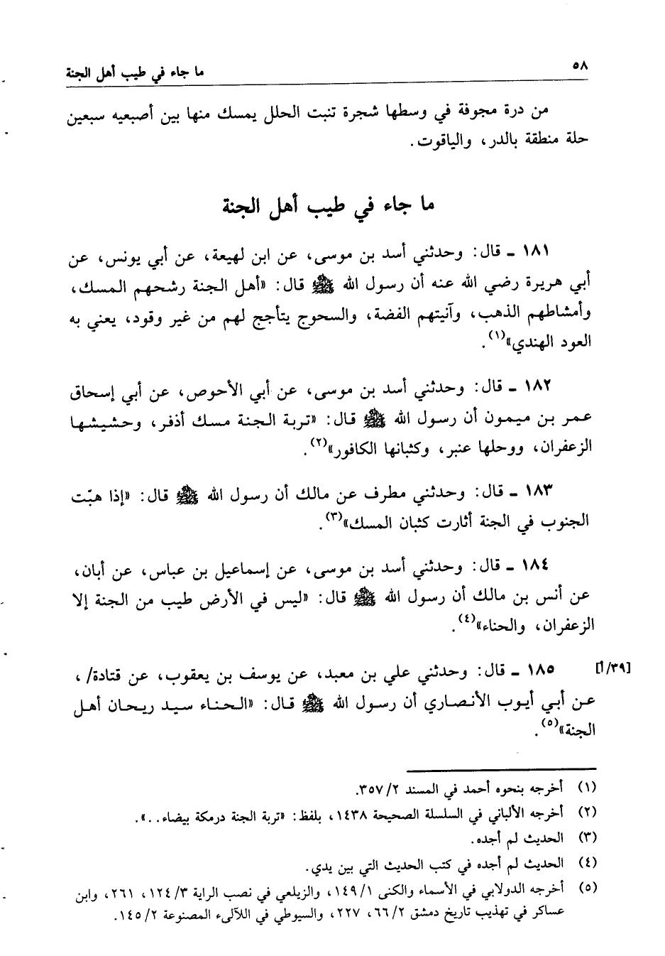 184- قال: وحدثني أسد بن موسى، عن إسماعيل بن عباس، عن أبان، عن أنس بن مالك أن رسول الله صلى الله عليه وسلم قال: ((ليس في الأرض طيب من الجنة إلا الزعفران، والحناء)).