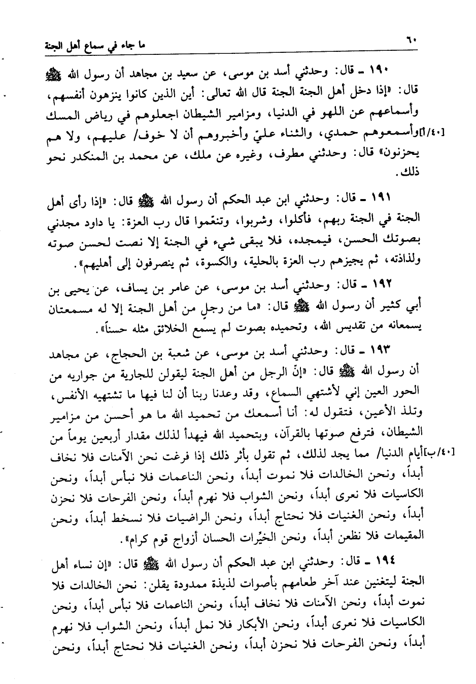 192- قال: وحدثني أسد بن موسى، عن عامر بن يساف، عن يحيى بن أبي كثير أن رسول الله صلى الله عليه وسلم قال: ((ما من رجلٍ من أهل الجنة إلا له مسمعتان يسمعانه من تقديس الله، وتحميده بصوت لم يسمع الخلائق مثله حسناً)).