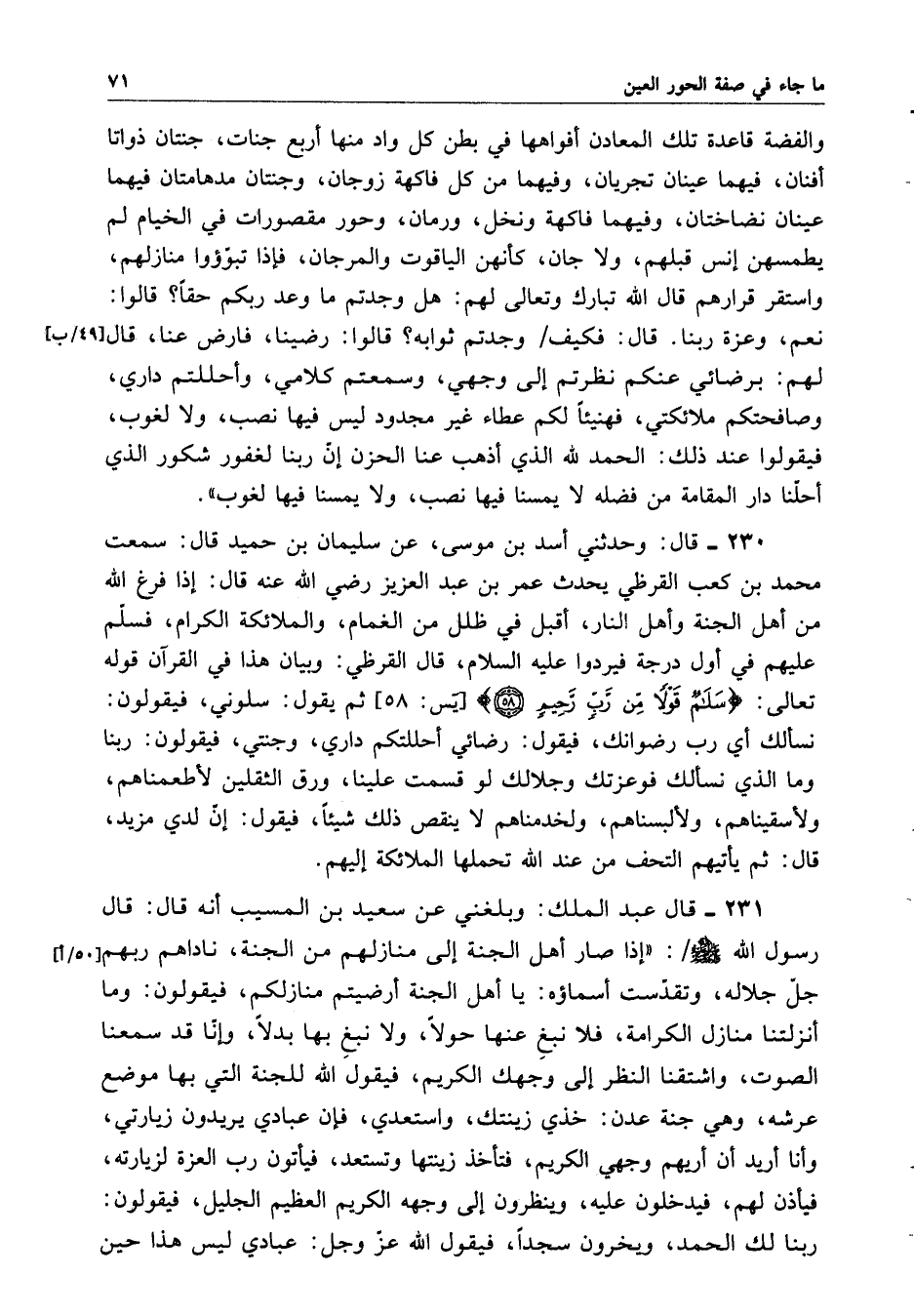 230- قال: وحدثني أسد بن موسى، عن سليمان بن حميد قال: سمعت محمد بن كعب القرظي يحدث عمر بن عبد العزيز رضي الله عنه قال: إذا فرغ الله من أهل الجنة وأهل النار، أقبل في ظلل من الغمام، والملائكة الكرام، فسلم عليهم في أول درجة فيردوا عليه السلام، قال القرظي: وبيان هذا في القرآن قوله تعال: {سلامٌ قولاً من ربٍ رحيمٍ} ثم يقول: سلوني، فيقولون: نسألك أي رب رضوانك، فيقول: رضائي أحللتكم داري، وجنتي، فيقولون: ربنا وما الذي نسألك فوعزتك وجلالك لو قسمت علينا، ورق الثقلين لأطعمناهم، ولأسقيناهم، ولألبسناهم، ولخدمناهم لا ينقص ذلك شيئاً، فيقول: إن لدي مزيد، قال: ثم يأتيهم التحف من عند الله تحملها الملائكة إليهم.