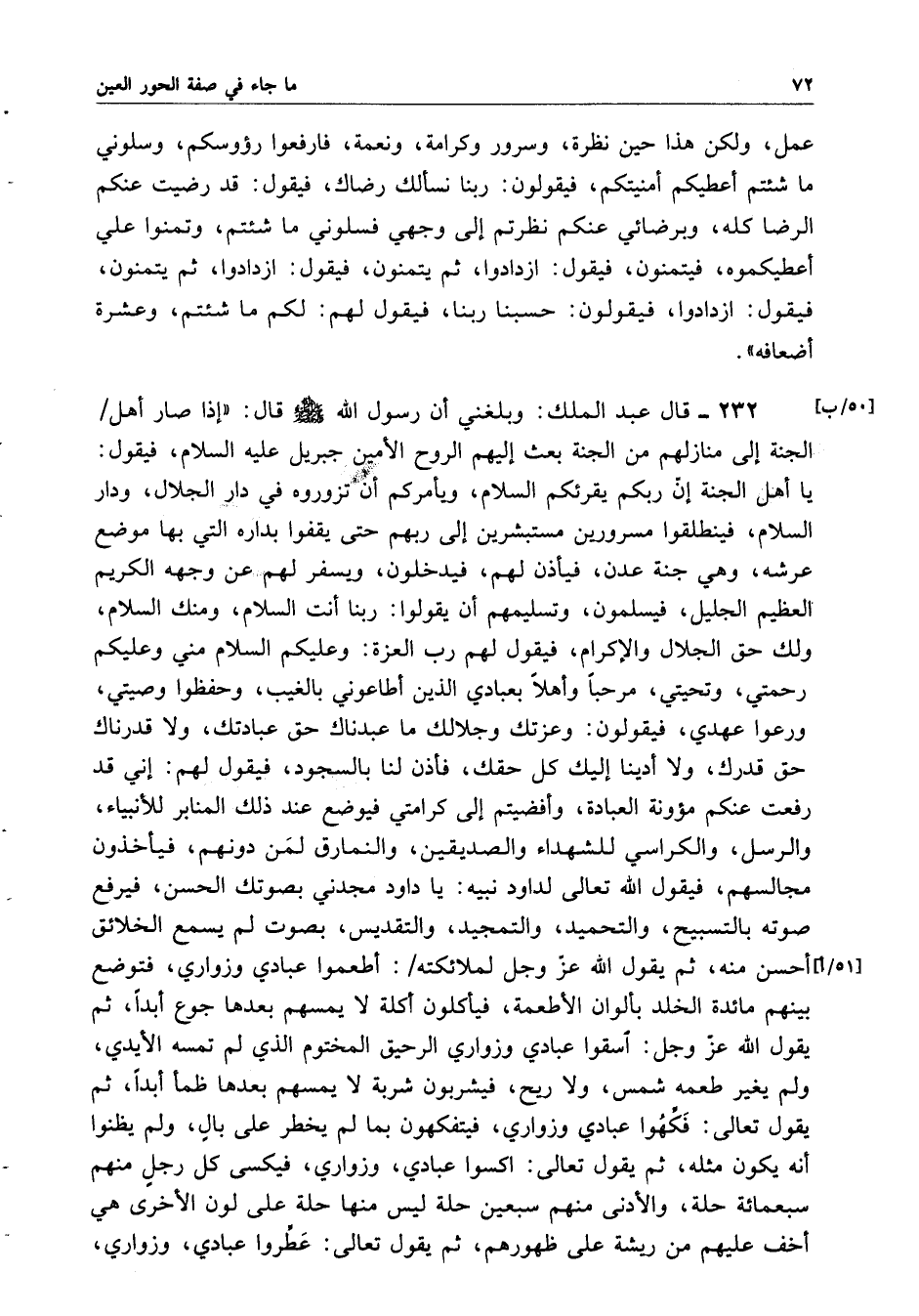 232- قال عبد الملك: وبلغني أن رسول الله صلى الله عليه وسلم قال: ((إذا صار أهل/ الجنة إلى منازلهم من الجنة بعث إليهم الروح الأمين جبريل عليه السلام، فيقول: يا أهل الجنة إن ربكم يقرئكم السلام، ويأمركم أن تزوروه في دار الجلال، ودار السلام، فينطلقوا مسرورين مستبشرين إلى ربهم حتى يقفوا بداره التي بها موضع عرشه، وهي جنة عدن، فيأذن لهم، فيدخلون، ويسفر لهم عن وجهه الكريم العظيم الجليل، فيسلمون، وتسليمهم أن يقولوا: ربنا أنت السلام، ومنك السلام، ولك حق الجلال والإكرام، فيقول لهم رب العزة: وعليكم السلام مني وعليكم رحمتي، وتحيتي، مرحباً وأهلاً بعبادي الذين أطاعوني بالغيب، وحفظوا وصيتي، ورعوا عهدي، فيقولون: وعزتك وجلالك ما عبدناك حق عبادتك، ولا قدرناك حق قدرك، ولا أدينا إليك كل حقك، فأذن لنا بالسجود، فيقول لهم: إني قد رفعت عنكم مؤونة العبادة، وأفضيتم إلى كرامتي فيوضع عند ذلك المنابر للأنبياء، والرسل، والكراسي للشهداء والصديقين، والنمارق لمن دونهم، فيأخذون مجالسهم، فيقول الله تعالى لداود نبيه: يا داود مجدني بصوتك الحسن، فيرفع صوته بالتسبيح، والتحميد، والتمجيد، والتقديس، بصوت لم يسمع الخلائق أحسن منه، ثم يقول الله عز وجل لملائكته/: أطعموا عبادي وزواري، فتوضع بينهم مائدة الخلد بألوان الأطعمة، فيأكلون أكلة لا يمسهم بعدها جوع أبداً، ثم يقول الله عز وجل: اسقوا عبادي وزواري الرحيق المختوم الذي لم تمسه الأيدي، ولم يغير طعمه شمس، ولا ريح، فيشربون شربة لا يمسهم بعدها ظمأ أبداً، ثم يقول تعالى: فكهوا عبادي وزواري، فيتفكهون بما لم يخطر على بالٍ، ولم يظنوا أنه يكون مثله، ثم يقول تعالى: اكسوا عبادي، وزواري، فيكسى كل رجلٍ منهم سبعمائة حلة، والأدنى منهم سبعين حلة ليس منها حلة على لون الأخرى هي أخف عليهم من ريشة على ظهورهم، ثم يقول تعالى: عطروا عبادي، وزواري،