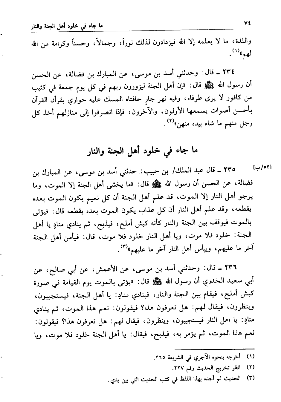 236- قال: وحدثني أسد بن موسى، عن الأعمش، عن أبي صالح، عن أبي سعيد الخدري أن رسول الله صلى الله عليه وسلم قال: ((يؤتى بالموت يوم القيامة في صورة كبش أملح، فيقام بين الجنة والنار، فينادي منادٍ: يا أهل الجنة، فيستجيبون، وينظرون، فيقال لهم: هل تعرفون هذا؟ فيقولون: نعم هذا الموت، ثم ينادي منادٍ: يا أهل النار فيستجيبون، وينظرون، فيقال لهم: هل تعرفون هذا؟ فيقولون: نعم هذا الموت، ثم يؤمر به، فيذبح، فيقال: يا أهل الجنة خلود فلا موت، ويا