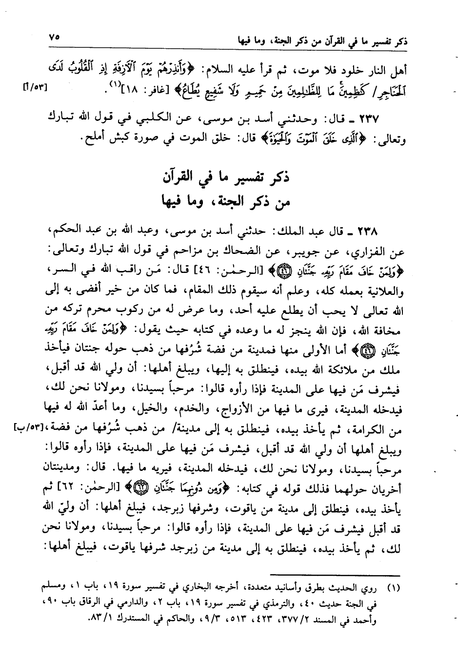 237- قال: وحدثني أسد بن موسى، عن الكلبي في قول الله تبارك وتعالى: {الذي خلق الموت والحياة} قال: خلق الموت في صورة كبش أملح.