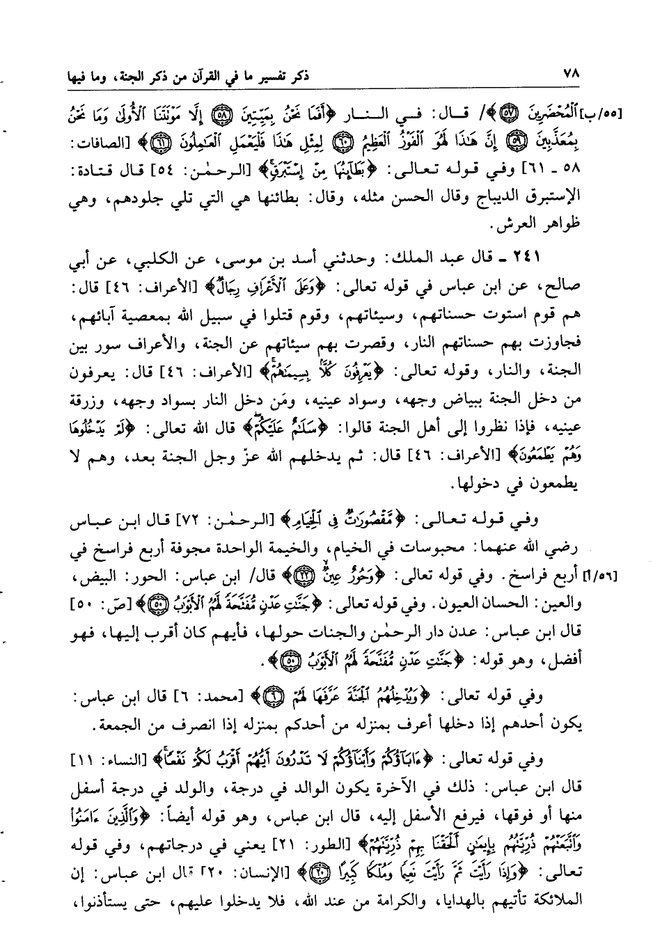 241- قال عبد الملك: وحدثني أسد بن موسى، عن الكلبي، عن أبي صالح، عن ابن عباس في قوله تعالى: {وعلى الأعراف رجالٌ} قال:هم قوم استوت حسناتهم، وسيئاتهم، وقوم قتلوا في سبيل الله بمعصية آبائهم، فجاوزت بهم حسناتهم النار، وقصرت بهم سيئاتهم عن الجنة، والأعراف سور بين الجنة، والنار، وقوله تعالى: {يعرفون كلاً بسيماهم} قال: يعرفون من دخل الجنة ببياض وجهه، وسواد عينيه، ومن دخل النار بسواد وجهه، وزرقة عينيه، فإذا نظروا إلى أهل الجنة قالوا: {سلام عليكم} قال الله تعالى: {لم يدخلوها وهم يطمعون} قال: ثم يدخلهم الله عز وجل الجنة بعد، وهم لا يطمعون في دخولها.