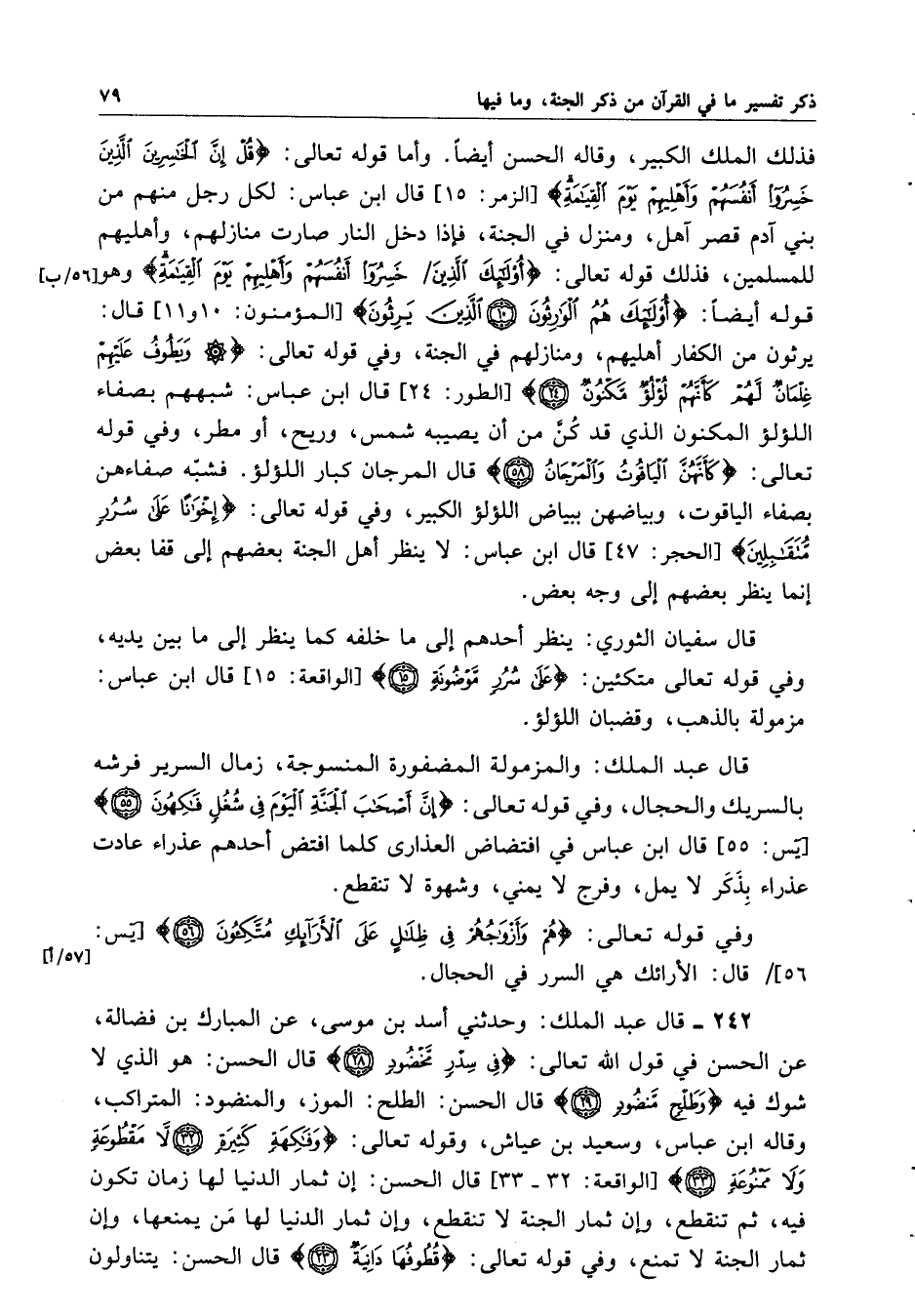 242- قال عبد الملك: وحدثني أسد بن موسى، عن المبارك بن فضالة، عن الحسن في قول الله تعالى: {في سدرٍ مخضودٍ} قال الحسن: هو الذي لا شوك فيه {وطلحٍ منضودٍ} قال الحسن: الطلح: الموز، والمنضود: المتراكب، وقاله ابن عباس، وسعيد بن عياش، وقوله تعالى: {وفاكهةٍ كثيرةٍ. لا مقطوعةٍ ولا ممنوعةٍ} قال الحسن: إن ثمار الدنيا لها زمان تكون فيه، ثم تنقطع، وإن ثمار الجنة لا تنقطع، وإن ثمار الدنيا لها من يمنعها، وإن ثمار الجنة لا تمنع، وفي قوله تعالى: {قطوفها دانيةٌ} قال الحسن: يتناولون