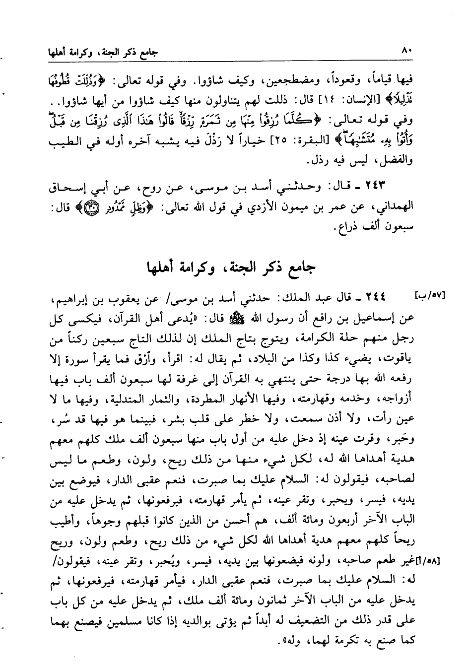 243- قال: وحدثني أسد بن موسى، عن روح، عن أبي إسحاق الهمداني، عن عمر بن ميمون الأزدي في قول الله تعالى: {{وظلٍ ممدودٍ} قال: سبعون ألف ذراع.