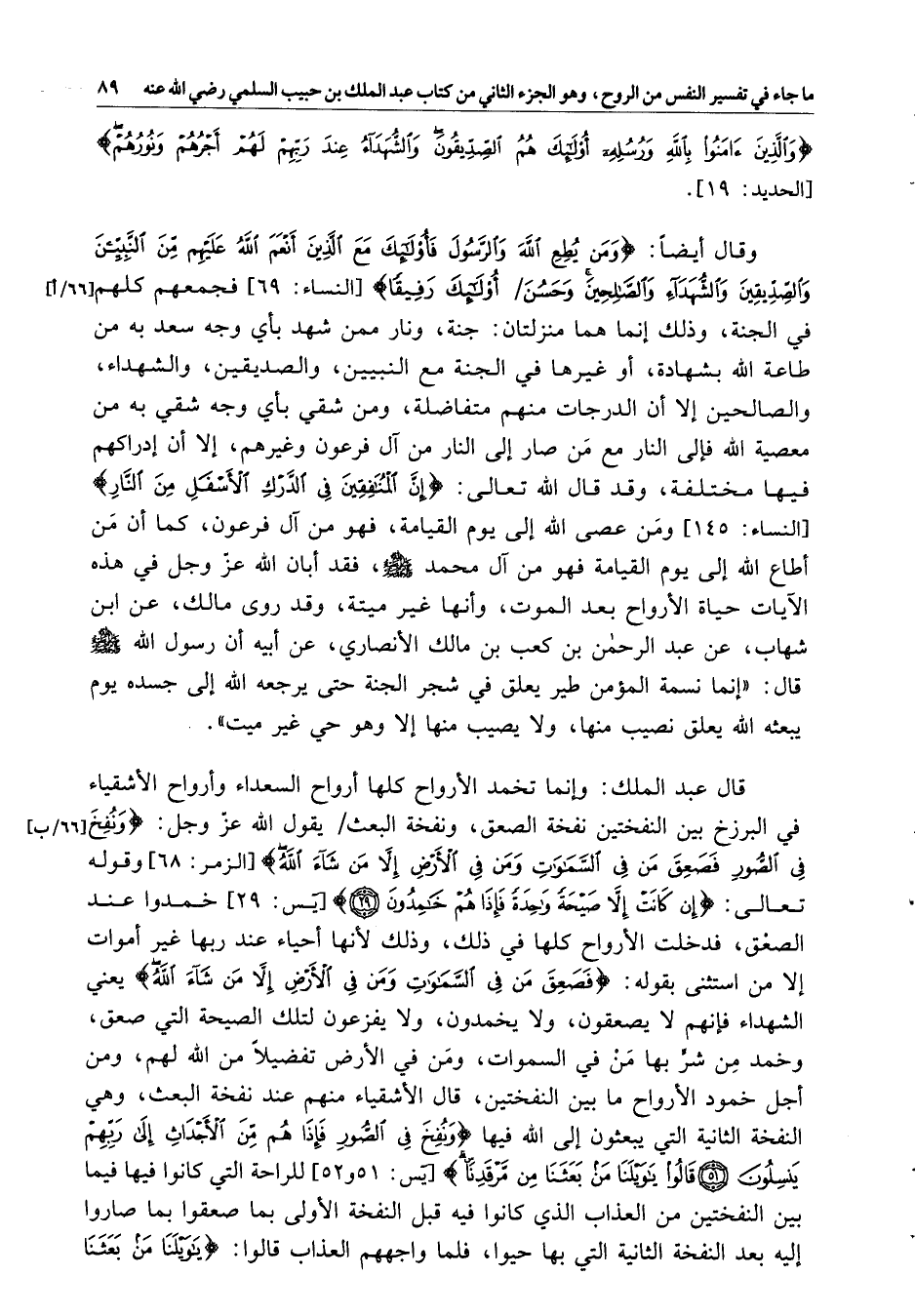 قال عبد الملك: وإنما تخمد الأرواح كلها أرواح السعداء وأرواح الأشقياء في البرزخ بين النفختين نفخة الصعق، ونفخة البعث/ يقول الله عز وجل: {ونفخ في الصور فصعق من في السموات ومن في والأرض إلا من شاء الله} وقوله تعالى: {إن كانت إلا صيحة واحدة فإذا هم خامدون} خمدوا عند الصعق، فدخلت الأرواح كلها في ذلك، وذلك لأنها أحياء عند ربها غير أموات إلا من استثنى بقوله: {فصعق من في السموات ومن في الأرض إلا من شاء الله} يعني الشهداء فإنهم لا يصعقون، ولا يخمدون، ولا يفزعون لتلك الصيحة التي صعق، وخمد من شر بها من في السموات، ومن في الأرض تفضيلاً من الله لهم، ومن أجل خمود الأرواح ما بين النفختين، قال الأشقياء منهم عند نفخة البعث، وهي النفخة الثانية التي يبعثون إلى الله فيها {ونفخ في الصور فإذا هم من الأجداث إلى ربهم ينسلون. قالوا يا ويلنا من بعثنا من مرقدنا} للراحة التي كانوا فيها فيما بين النفختين من العذاب الذي كانوا فيه قبل النفخة الأولى بما صعقوا بما صاروا إليه بعد النفخة الثانية التي بها حيوا، فلما واجههم العذاب قالوا: {يا ويلنا من بعثنا
