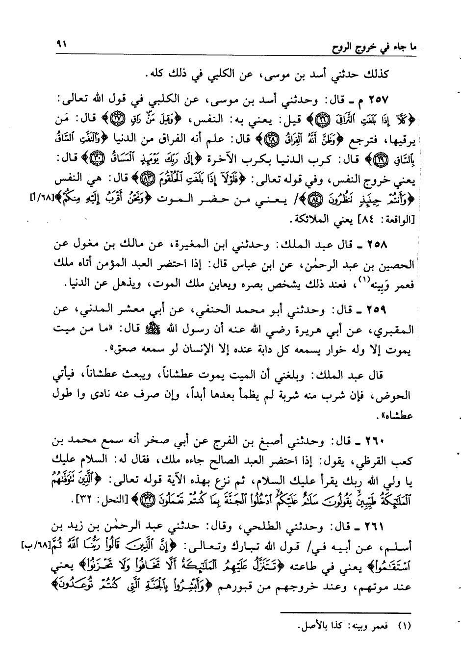 257م- قال: وحدثني أسد بن موسى، عن الكلبي في قول الله تعالى: {كلا إذا بلغت التراقي} قيل: يعني به: النفس، {وقيل من راقٍ} قال: من يرقيها، فترجع {وظن أنه الفراق} قال: علم أنه الفراق من الدنيا {والتفت الساق بالساق} قال: كرب الدنيا بكرب الآخرة {إلى ربك يومئذ المساق} قال: يعني خروج النفس، وفي قوله تعالى: {فلولا إذا بلغت الحلقوم} قال: هي النفس {وأنتم حينئذ تنظرون}/ يعني من حضر الموت {ونحن أقرب إليه منكم} يعني الملائكة.