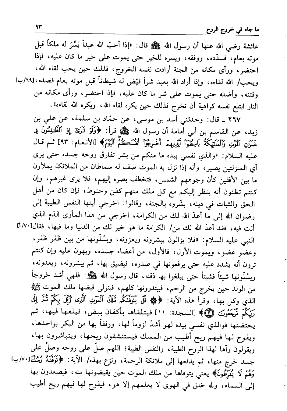 267- قال: وحدثني أسد بن موسى، عن حماد بن سلمة، عن علي بن زيد، عن القاسم بن أبي أمامة أن رسول الله صلى الله عليه وسلم قرأ: {ولو ترى إذ الظالمون في غمرات الموت والملائكة باسطوا أيديهم أخرجوا أنفسكم اليوم} ثم قال عليه السلام : ((والذي نفسي بيده ما منكم من بشر تفارق روحه جسده حتى يرى أي المنزلتين يصير، وأنه إذا نزل به الموت صف له سماطان من الملائكة يملأون ما بين الأفقين كأن وجوههم الشمس، فتخطف بصره إليهم، فلا يرى غيرهم، وإن كنتم تظنون أنه ينظر إليكم مع كل ملك منهم كفن وحنوط، فإن كان من أهل الحق والثبات في دينه، بشروه بالجنة، وقالوا: اخرجي أيتها النفس الطيبة إلى رضوان الله إلى ما أعد الله لك من الكرامة، اخرجي من هذا المأوى الذم الذي أنت فيه، فقد أعد الله لك من/ الكرامة ما هو خير لك من الدنيا وما فيها، فقال النبي عليه السلام : ((فلا يزالون يبشرونه ويعزونه، ويسلونها من بين ظفر ظفر، وعضو عضو، ويموت الأول، فالأول، من أعضاء جسده، ويهون عليه وإن كنتم ترون أنه يشدد عليه حتى يرفعونها في صدره، فيضيق بها، ثم يبشرونه، ويعدونه، ويسلونها شيئاً فشيئاً حتى يبلغوا بها ذقنه، قال رسول الله صلى الله عليه وسلم : فلهي أشد خروجاً من الولد حين يخرج من الرحم، فيبتدرونها كلهم، فيتولى قبضها ملك الموت صلى الله عليه وسلم الذي وكل بها، وقرأ هذه الآية: {قل يتوفاكم ملك الموت الذي وكل بكم ثم إلى ربكم ترجعون} فيتلقاها بأكفان بيض، فيلفها فيها، ثم يحتضنها فوالذي نفسي بيده لهو أشد لزوماً لها، ورفقاً بها من البكر بواحدها، ويفوح لها فيهم ريح أطيب من المسك فيستنشقون ريحها، ويتباشرون بها، ويقولون رآها لهذا الروح الطيبة، والنفس الطيبة؛ اللهم صل على روحه وصل على جسد خرج منها، ثم يدفعها إلى ملائكة الرحمة، ونزع بهذه/ الآية: {توفته رسلنا وهم لا يفرطون} يعني يتوفاها من ملك الموت حين يقبضونها منه، فيصعدون بها إلى السماء، ولله خلق في الهوى لا يعلمهم إلا هو، فيفوح لها فيهم ريح أطيب