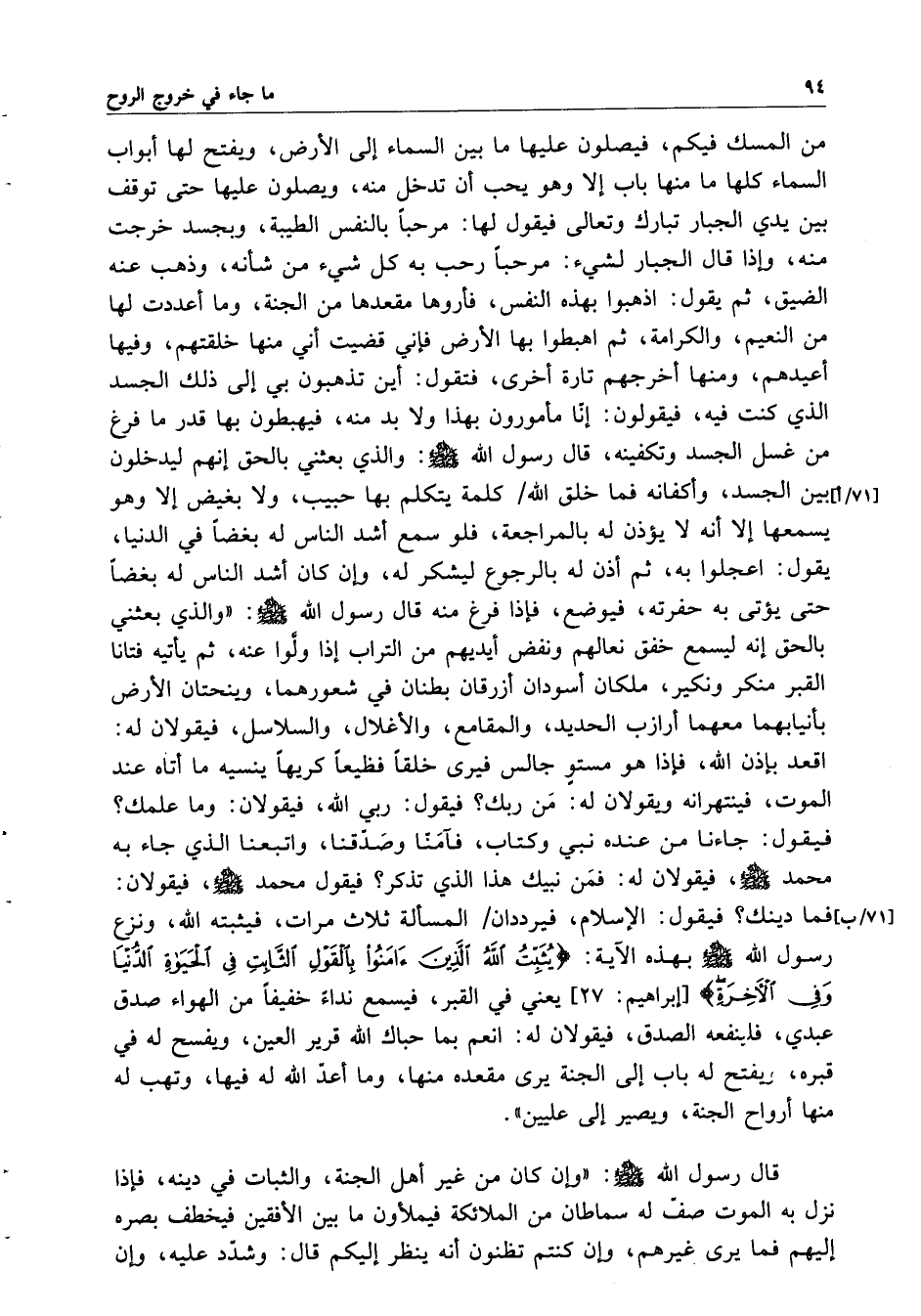 من المسك فيكم، فيصلون عليها ما بين السماء والأرض، ويفتح لها أبواب السماء كلها ما منها باب إلا وهو يحب أن تدخل منه، ويصلون عليها حتى توقف بين يدي الجبار تبارك وتعالى فيقول لها: مرحباً بالنفس الطيبة، وبجسد خرجت منه، وإذا قال الجبار لشيء: مرحباً رحب به كل شيء من شأنه، وذهب عنه الضيق، ثم يقول: اذهبوا بهذه النفس، فأروها مقعدها من الجنة، وما أعددت لها من النعيم، والكرامة، ثم اهبطوا بها الأرض فإني قضيت أني منها خلقتهم، وفيها أعيدهم، ومنها أخرجهم تارة أخرى، فتقول: أين تذهبون بي إلى ذلك الجسد الذي كنت فيه، فيقولون: إنا مأمورون بهذا ولا بد منه، فيهبطون بها قدر ما فرغ من غسل الجسد وتكفينه، قال رسول الله صلى الله عليه وسلم : والذي بعثني بالحق إنهم ليدخلون بين الجسد، وأكفانه فما خلق الله/ كلمة يتكلم بها حبيب، ولا بغيض إلا وهو يسمعها إلا أنه لا يؤذن له بالمراجعة، فلو سمع أشد الناس له بغضاً في الدنيا، يقول: اعجلوا به، ثم أذن له بالرجوع ليشكر له، وإن كان أشد الناس له بغضاً حتى يؤتى به حفرته، فيوضع، فإذا فرغ منه قال رسول الله صلى الله عليه وسلم : ((والذي بعثني بالحق إنه ليسمع خفق نعالهم ونفض أيديهم من التراب إذا ولوا عنه، ثم يأتيه فتانا القبر منكر ونكير، ملكان أسودان أزرقان بطنان في شعورهما، وينحتان الأرض بأنيابهما معهما أرازب الحديد، والمقامع، والأغلال، والسلاسل، فيقولون له: اقعد بإذن الله، فإذا هو مستوٍ جالس فيرى خلقاً فظيعاً كريهاً ينسيه ما أتاه عند الموت، فينتهرانه ويقولان له: من ربك؟ فيقول: ربي الله، فيقولان: وما علمك؟ فيقول: جاءنا من عنده نبي وكتاب، فآمنا وصدقنا، واتبعنا الذي جاء به محمد صلى الله عليه وسلم ، فيقولان له: فمن نبيك هذا الذي تذكر؟ فيقول محمد صلى الله عليه وسلم ، فيقولان: فما دينك؟ فيقول: الإسلام، فيرددان/ المسألة ثلاث مرات، فيثبته الله، ونزع رسول الله صلى الله عليه وسلم بهذه الآية: {يثبت الله الذين ءامنوا بالقول الثابت في الحياة الدنيا وفي الآخرة} يعني في القبر، فيسمع نداءً خفيفاً من الهواء صدق عبدي، فلينفعه الصدق، فيقولان له: انعم بما حباك الله قرير العين، ويفسح له في قبره، ويفتح له باب إلى الجنة يرى مقعده منها، وما أعد الله له فيها، وتهب له منها أرواح الجنة، ويصير إلى عليين)).