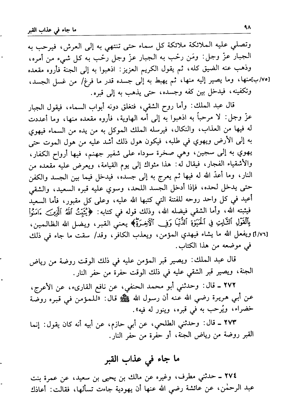 قال عبد الملك: ويصير قبر المؤمن عليه في ذلك الوقت روضة من رياض الجنة، ويصير قبر الشقي عليه في ذلك الوقت حفرة من حفر النار.